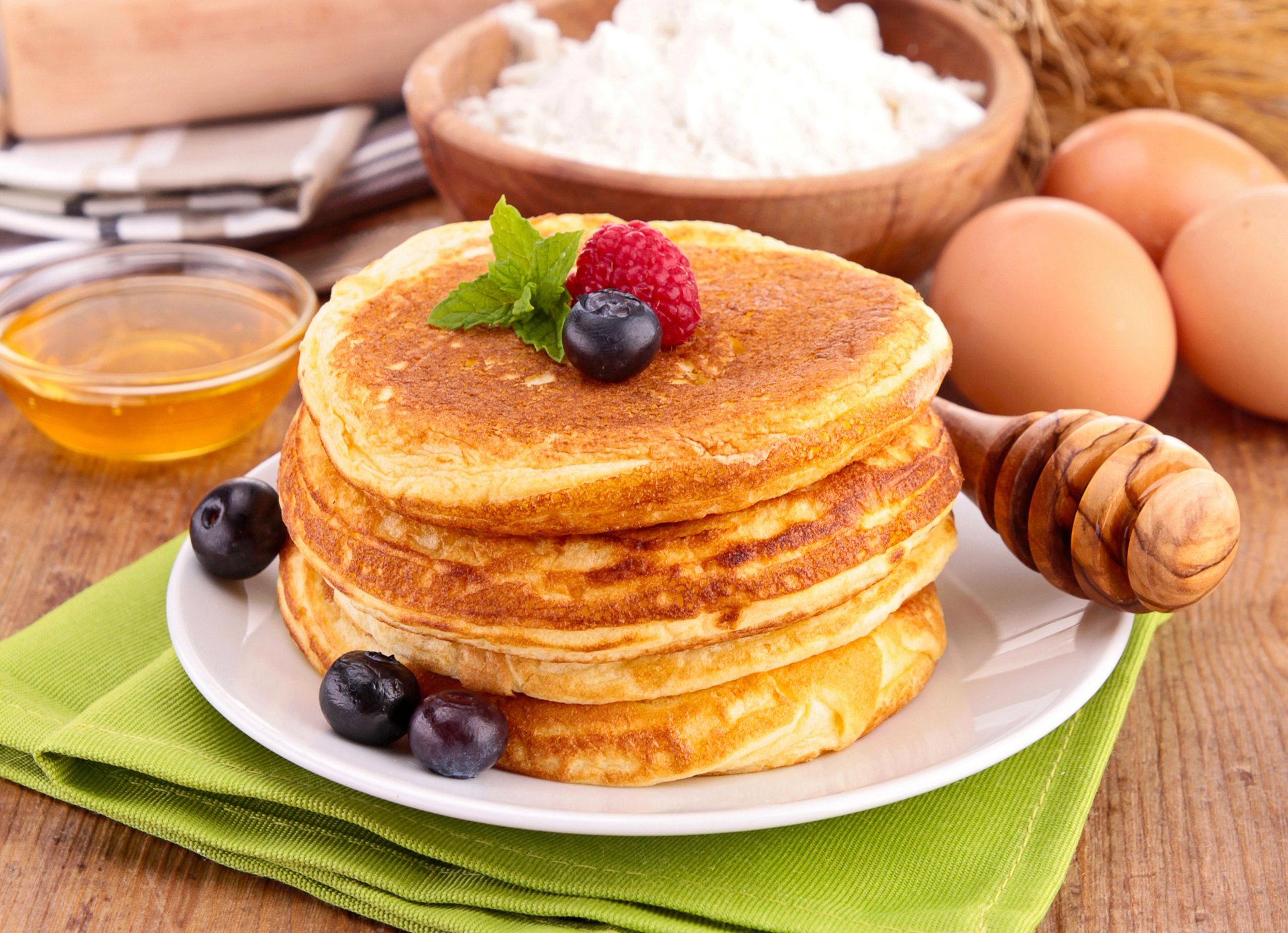 Placki na talerzu skropione miodem z jagodami, jeżynami i truskawkami