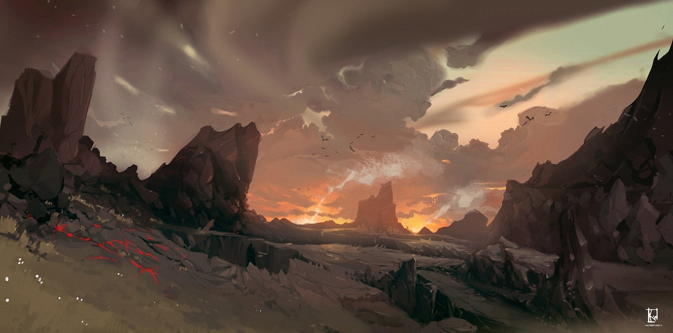 Malowany akwarelą krajobraz na tle pięknego zachodu Słońca
