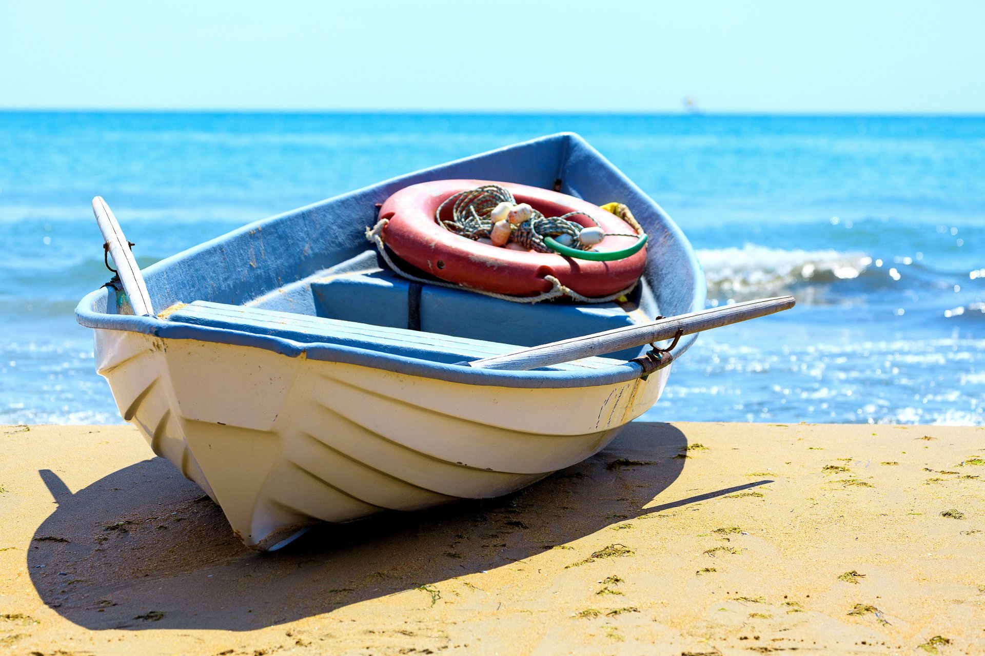 Statek na brzegu. Czysta plaża. Niebieska łyżka