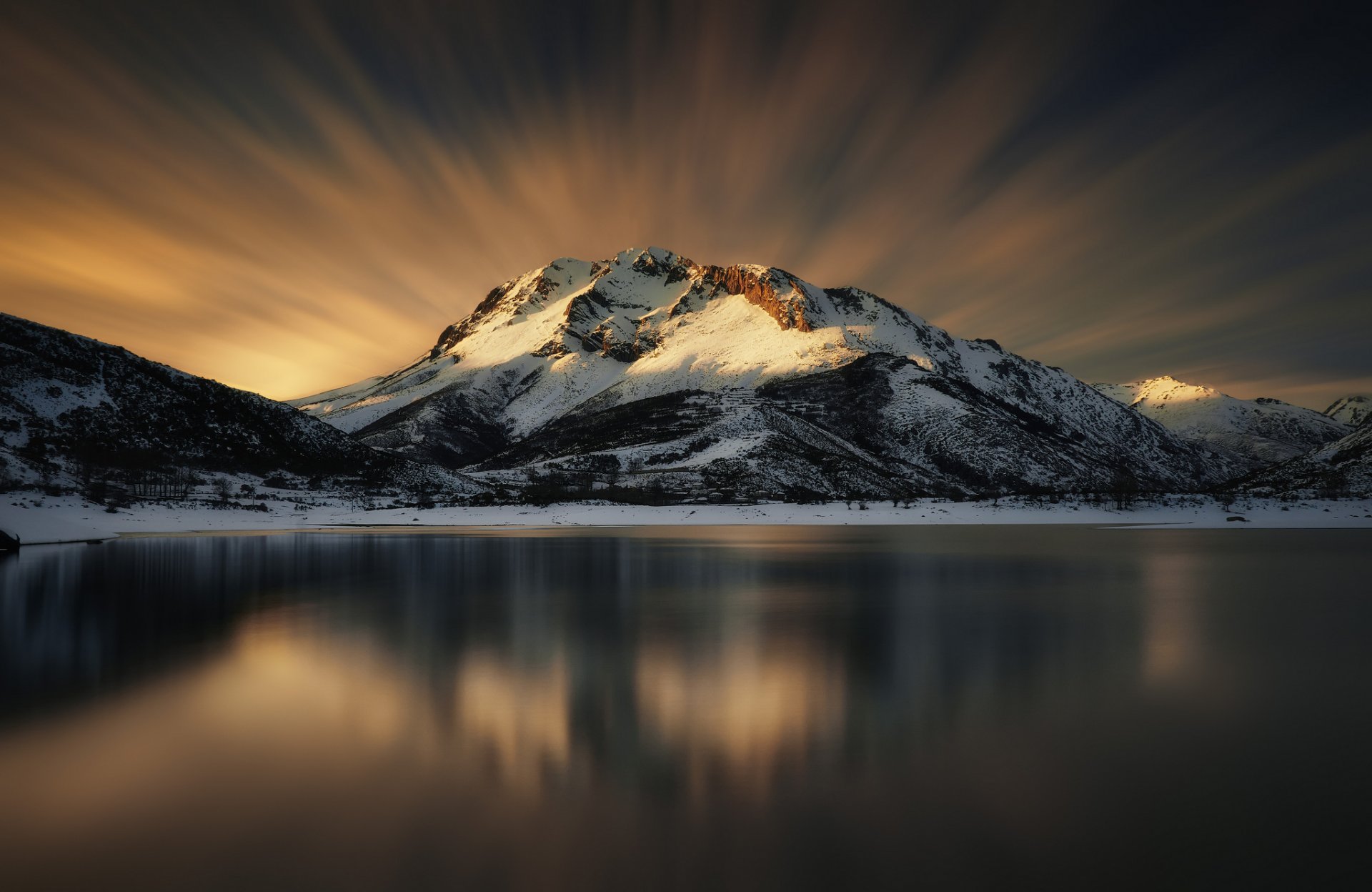 Odbicie gór na wodzie. Czarno-białe zdjęcie