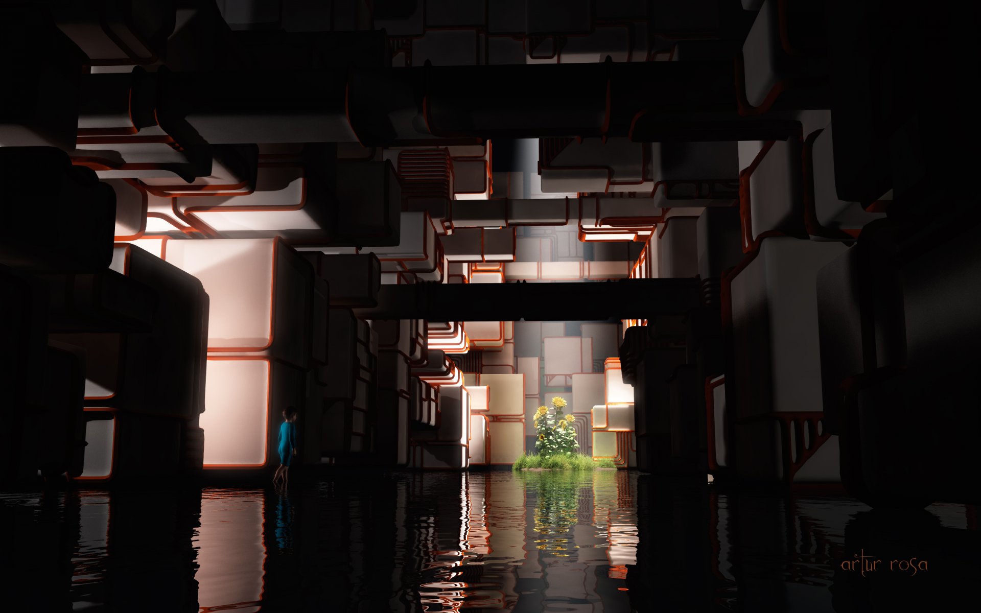 Ciemny korytarz z wodą i wyspa ze słonecznikami