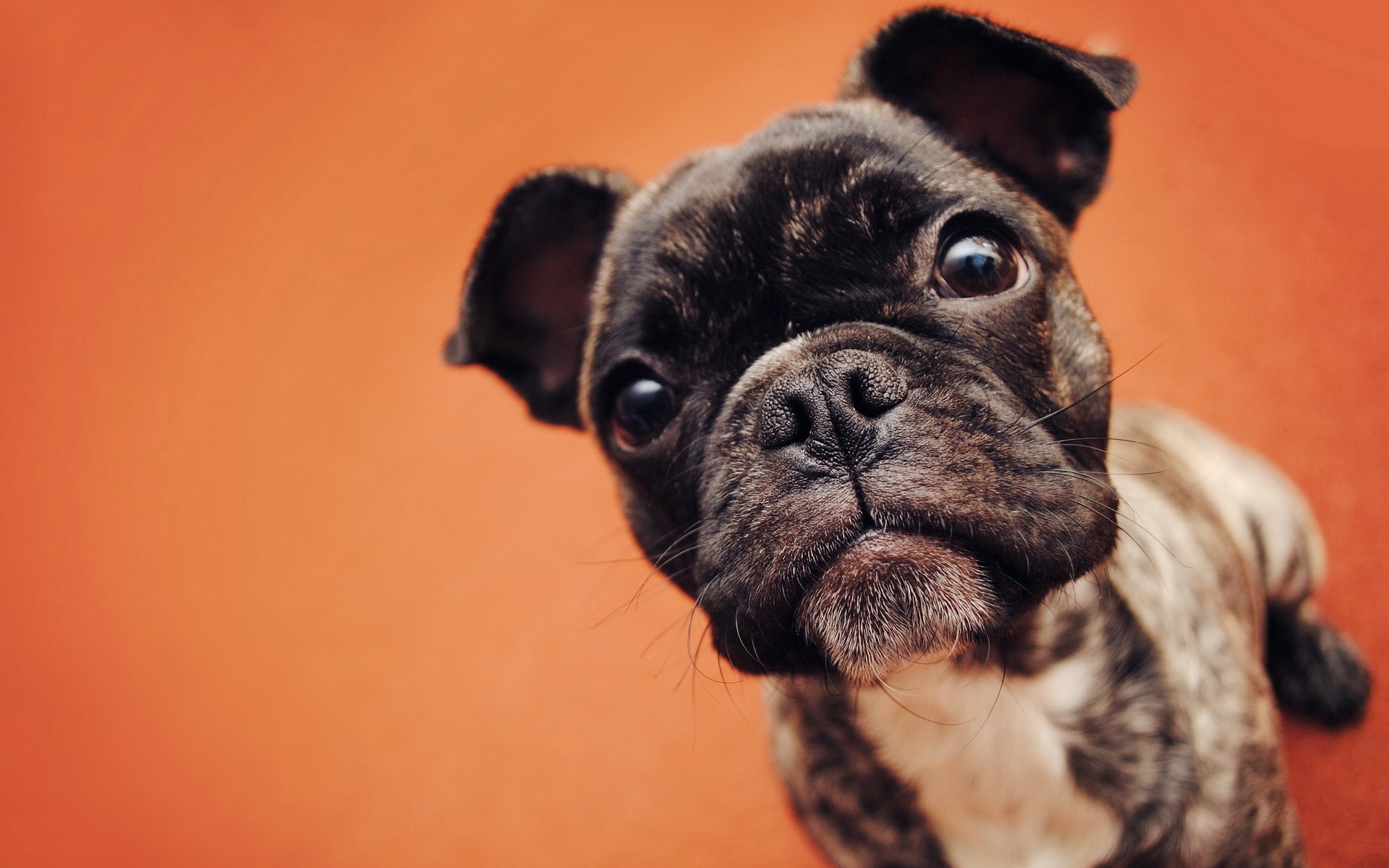 Mały ciekawy pies na pomarańczowym tle