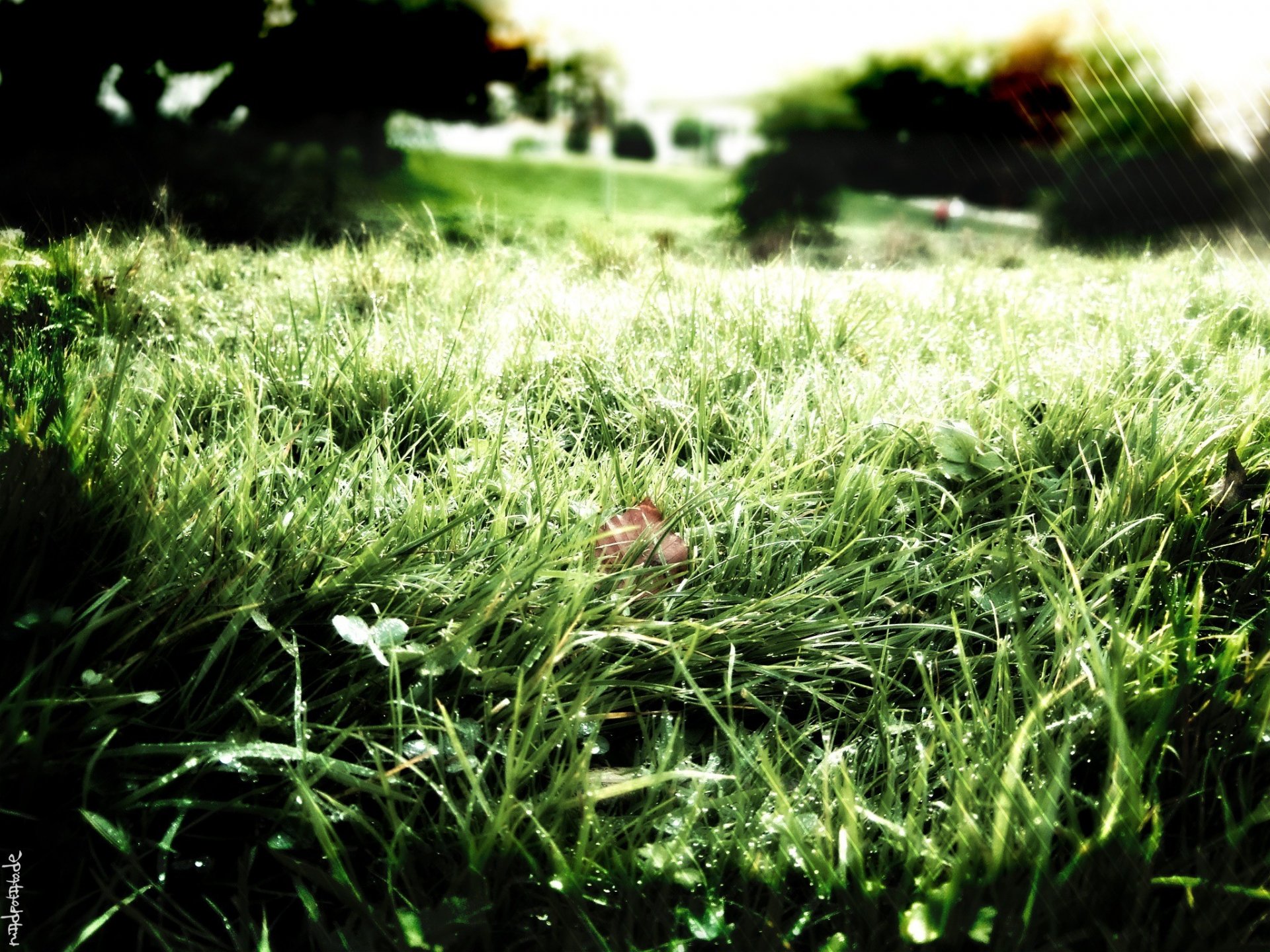 Poranna rosa za trawą pod promieniami słońca
