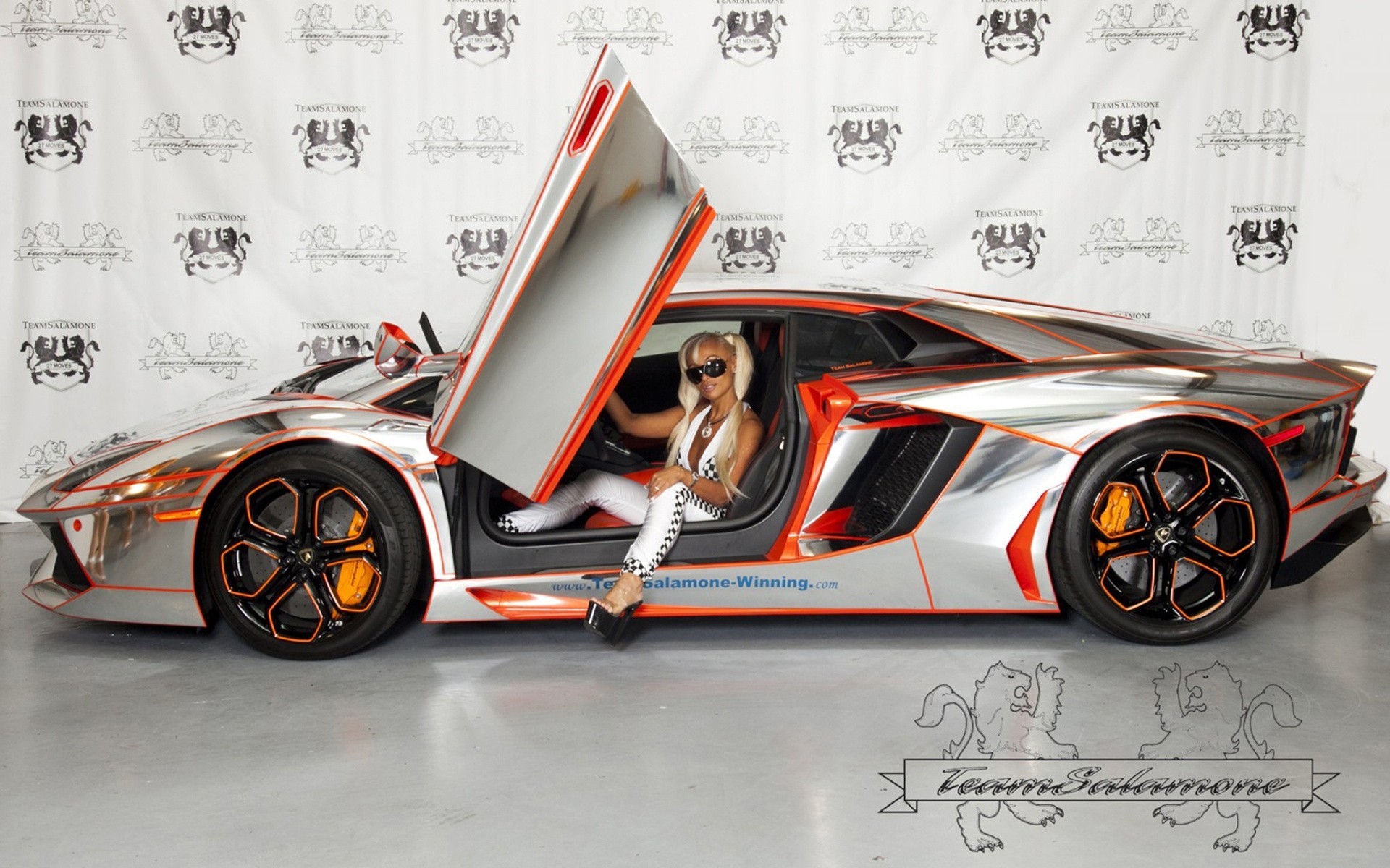 Mężczyzna w szarej koszulce polo i żółtym samochodzie