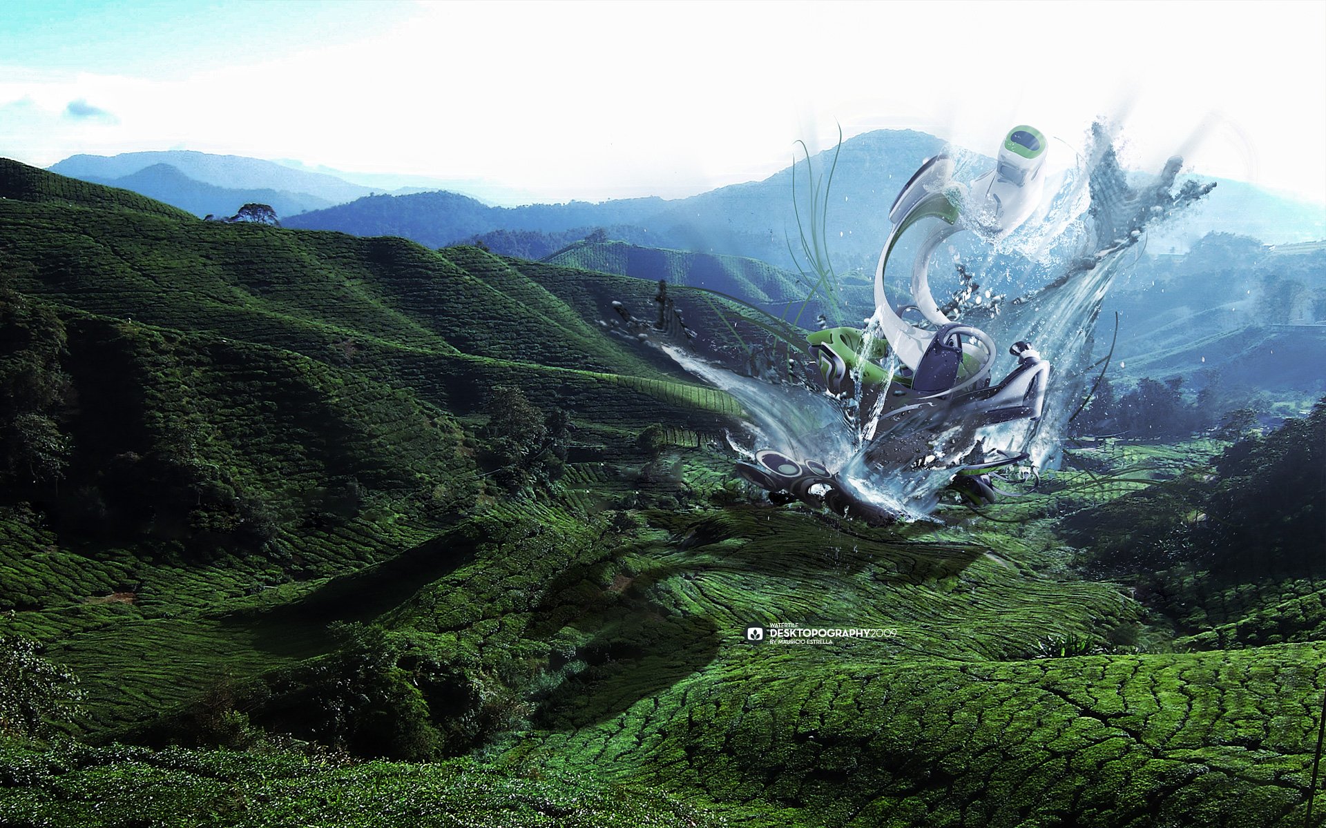 Futurystyczny wybuch w środku zielonych gór