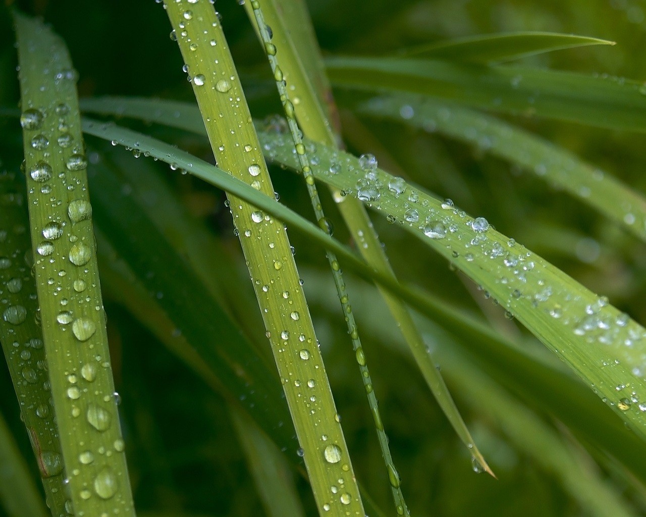 Krople rosy na wąskim liściu