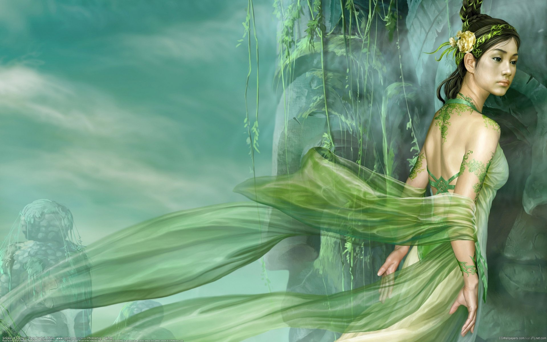 Piękna dziewczyna lasu w zielonej sukience, wokół mgła