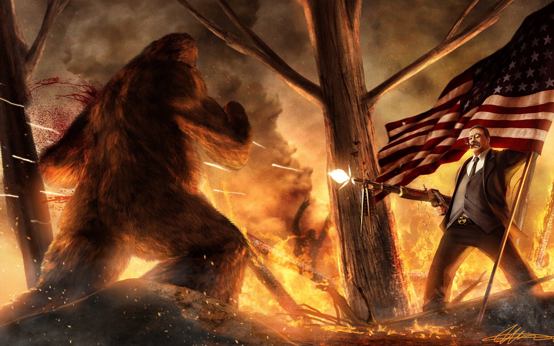 Mężczyzna z flagą USA strzela do niedźwiedzia