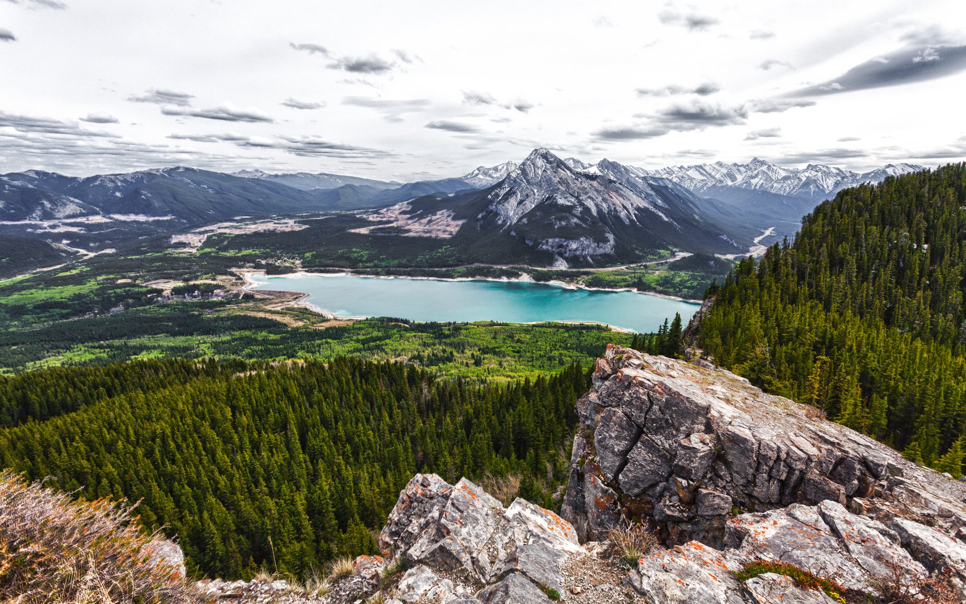 Kanada, ośnieżone góry, most nad rzeką, las z drzewami świerkowymi