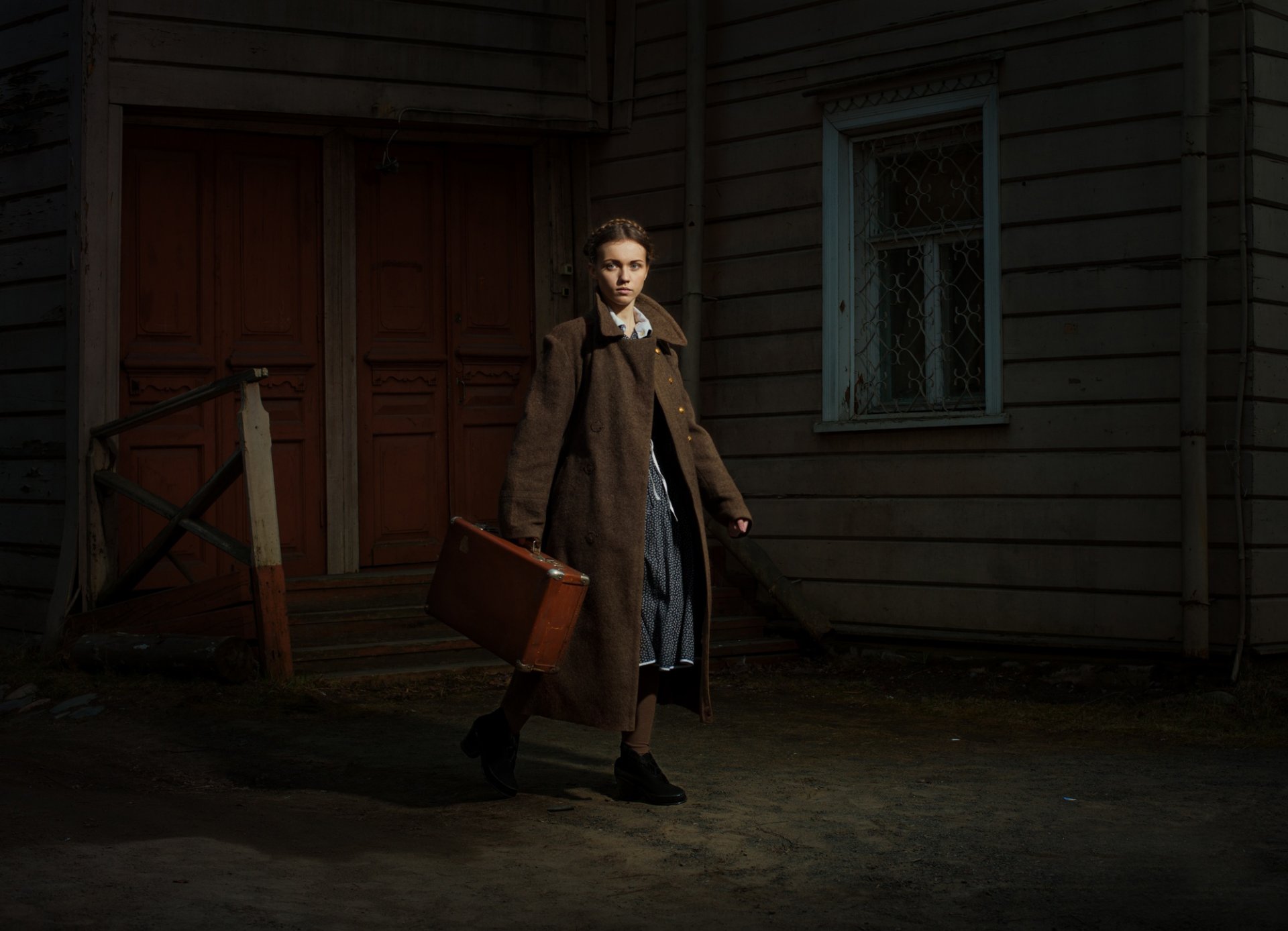Vintage zdjęcie dziewczyny z walizką w rękach