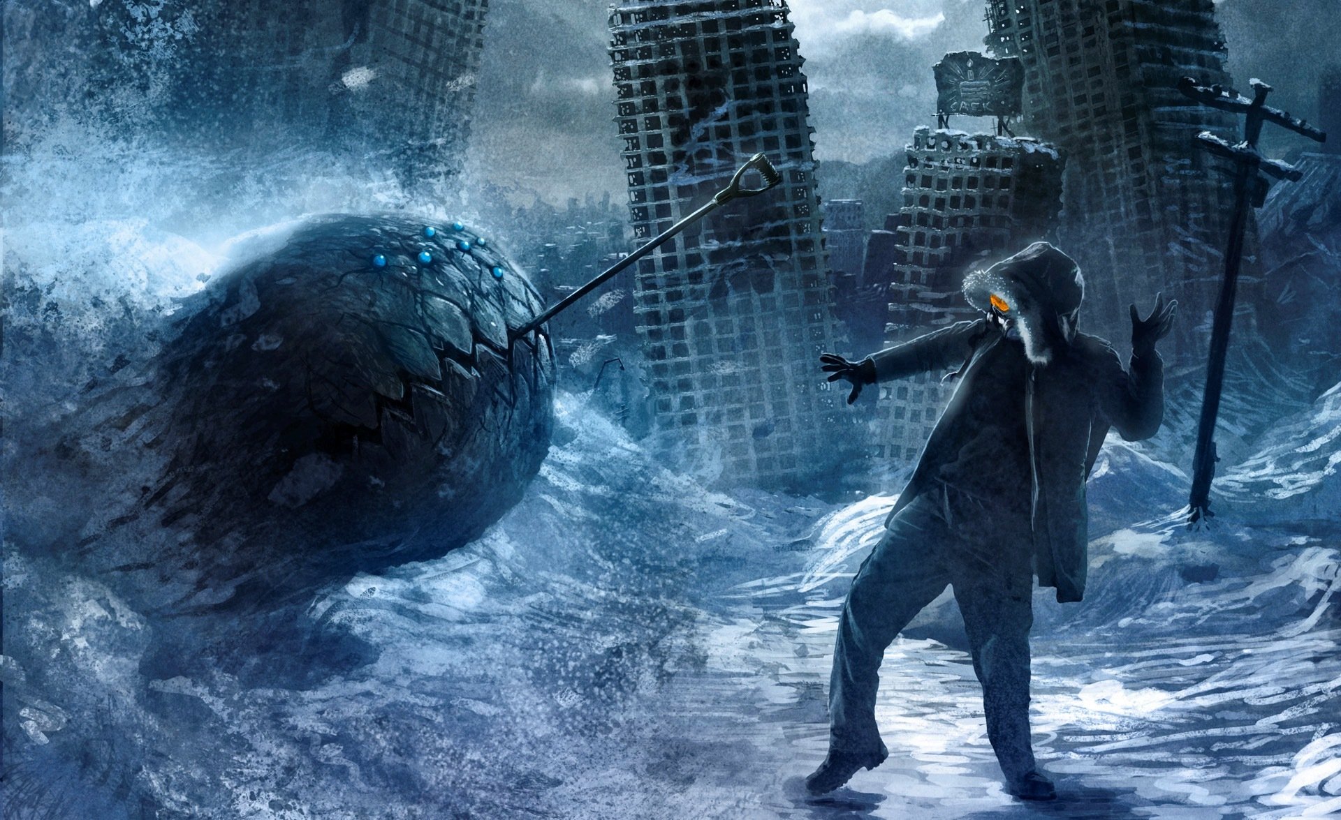 Wilk z rogami jelenia biegnie po trawie do opuszczonego miasta