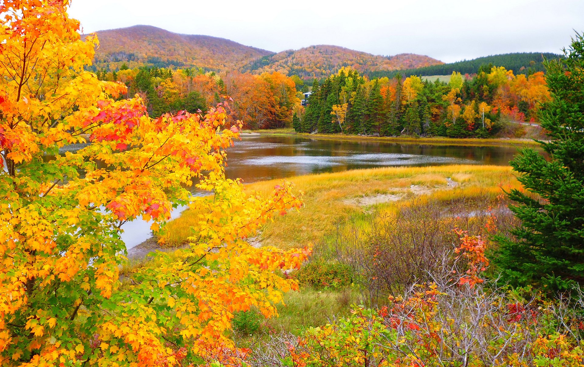 Jesienny krajobraz z domami, drzewami na tle zachmurzonego nieba