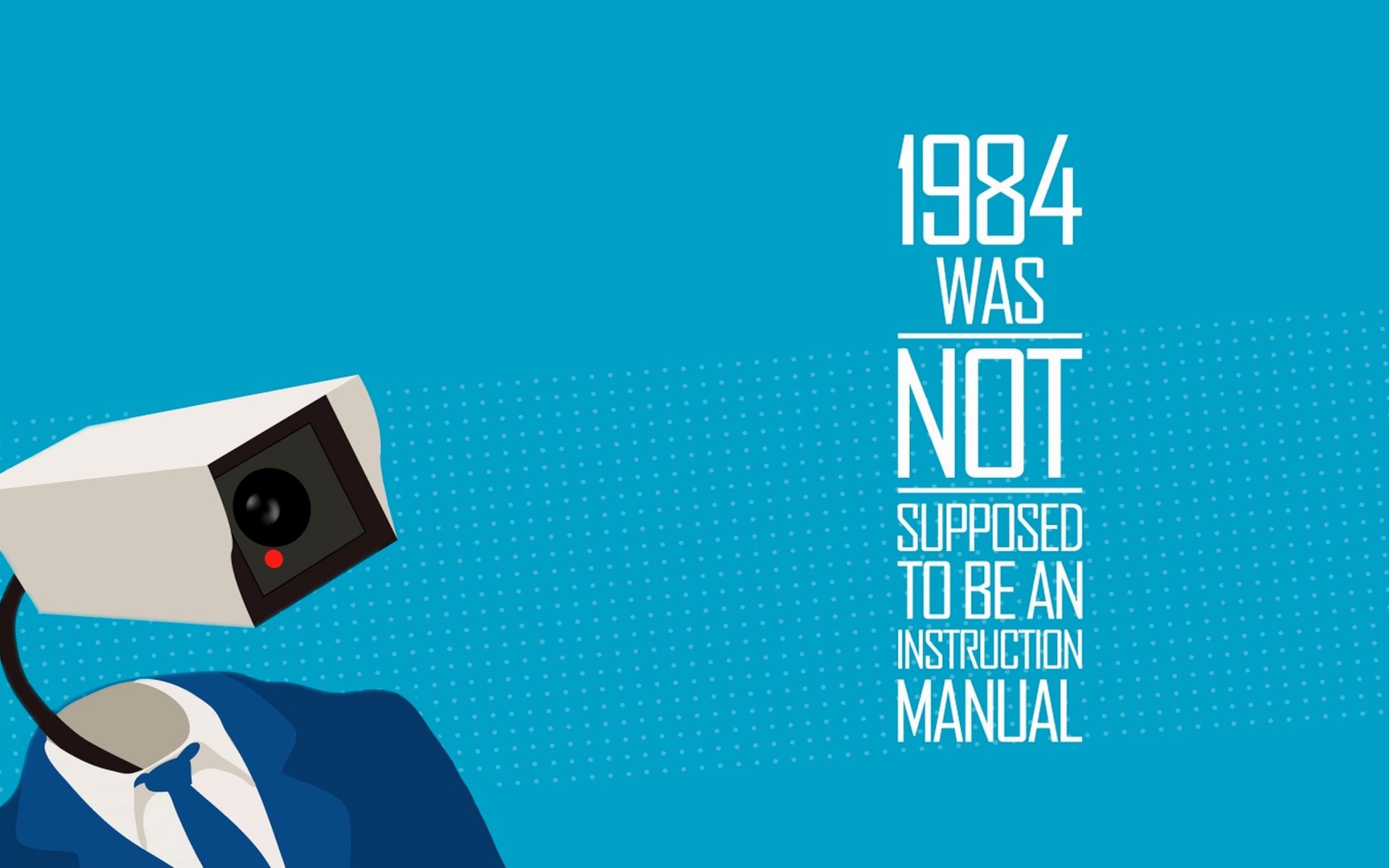 Kamera z drutem wystającym z męskiego garnituru i napis na niebieskim tle