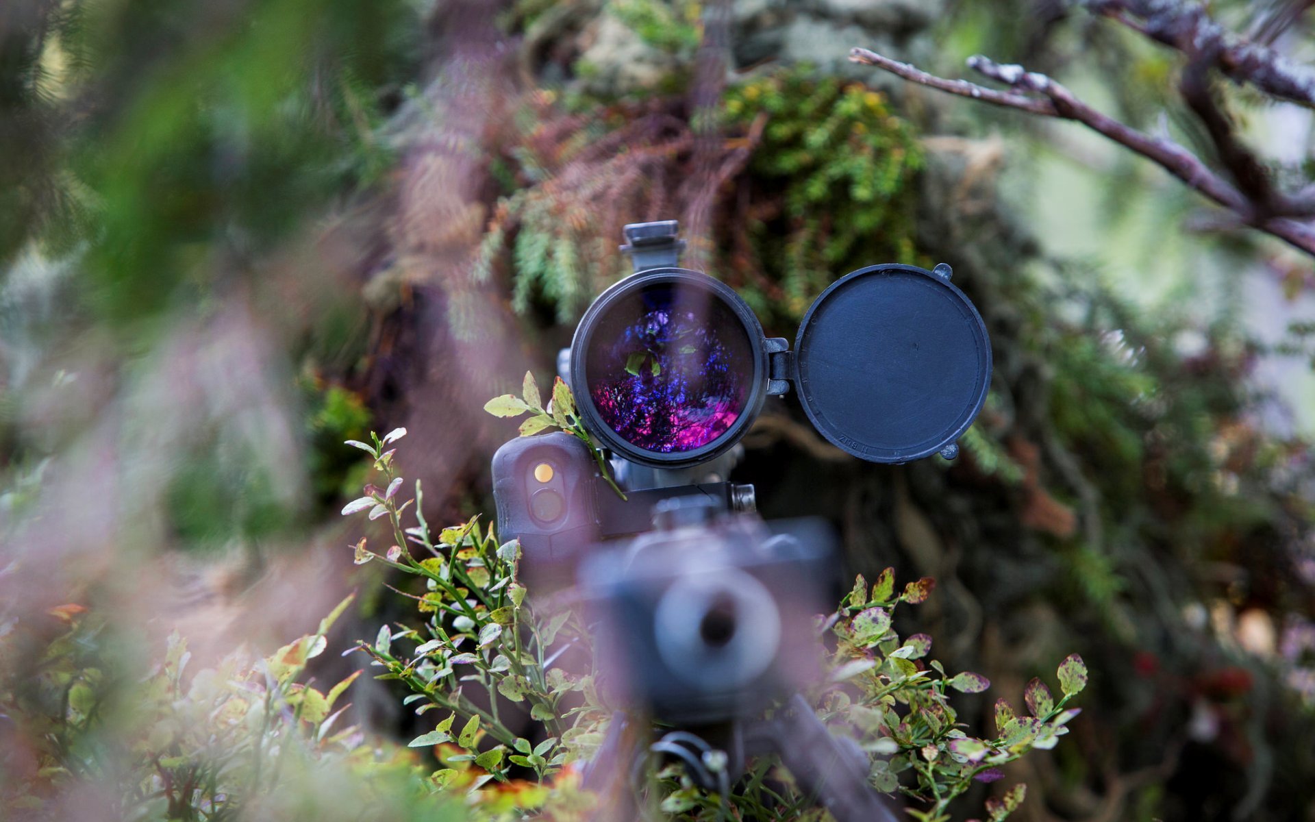 Człowiek w komuflażu, w lesie z miotaczem ognia