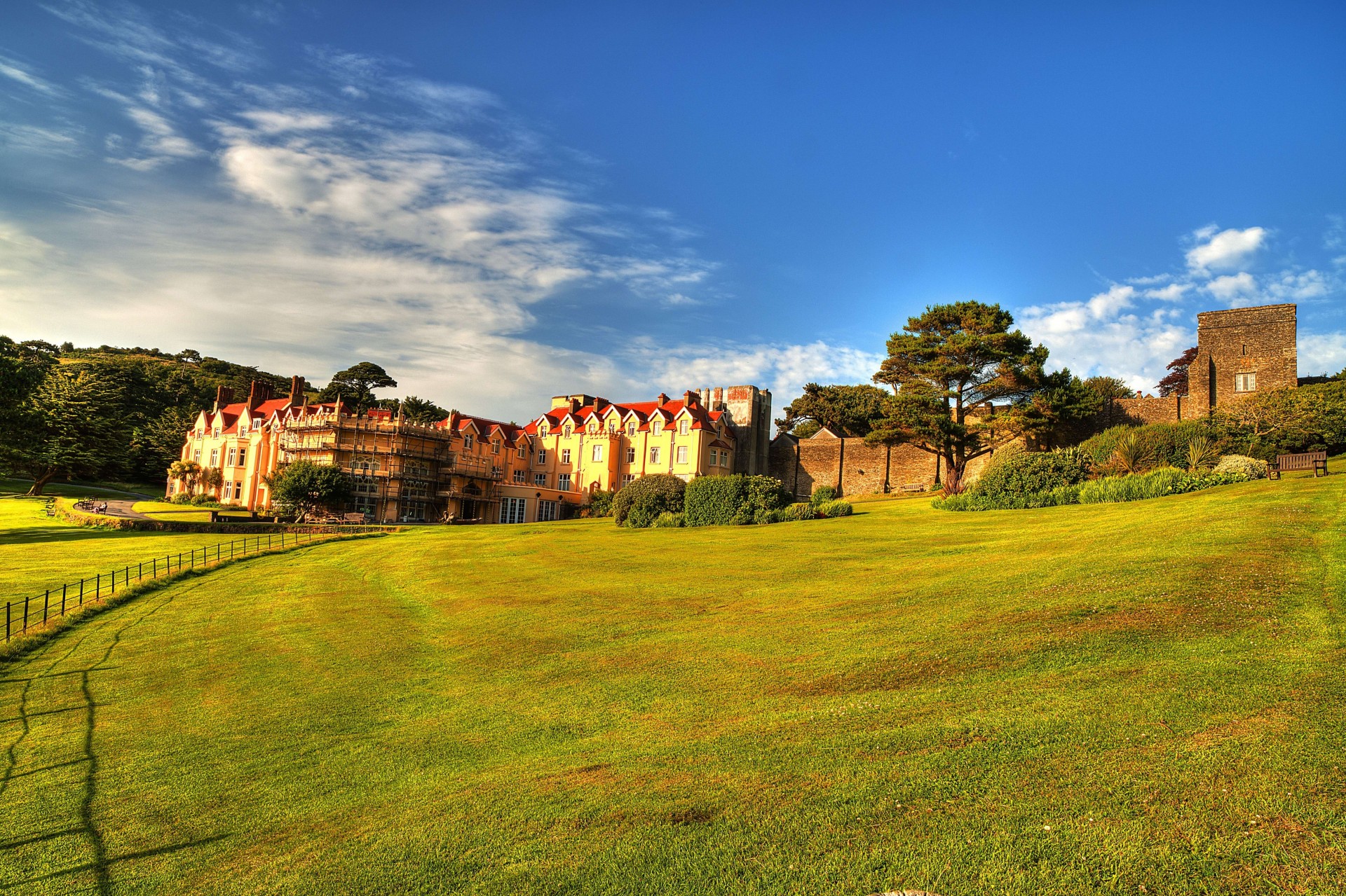 Duchy buntują się w hrabstwie Somerset w Wielkiej Brytanii wieczorem, gdy Zatoka, niebiesko-różowe niebo i chmury