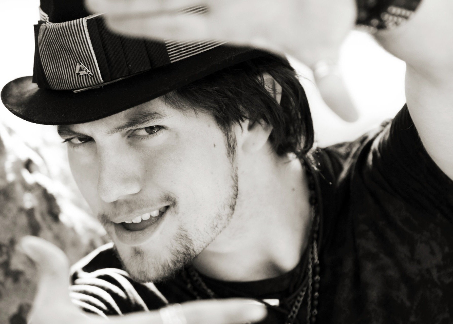 Portret Taylora w kraciastej koszuli na tle miasta
