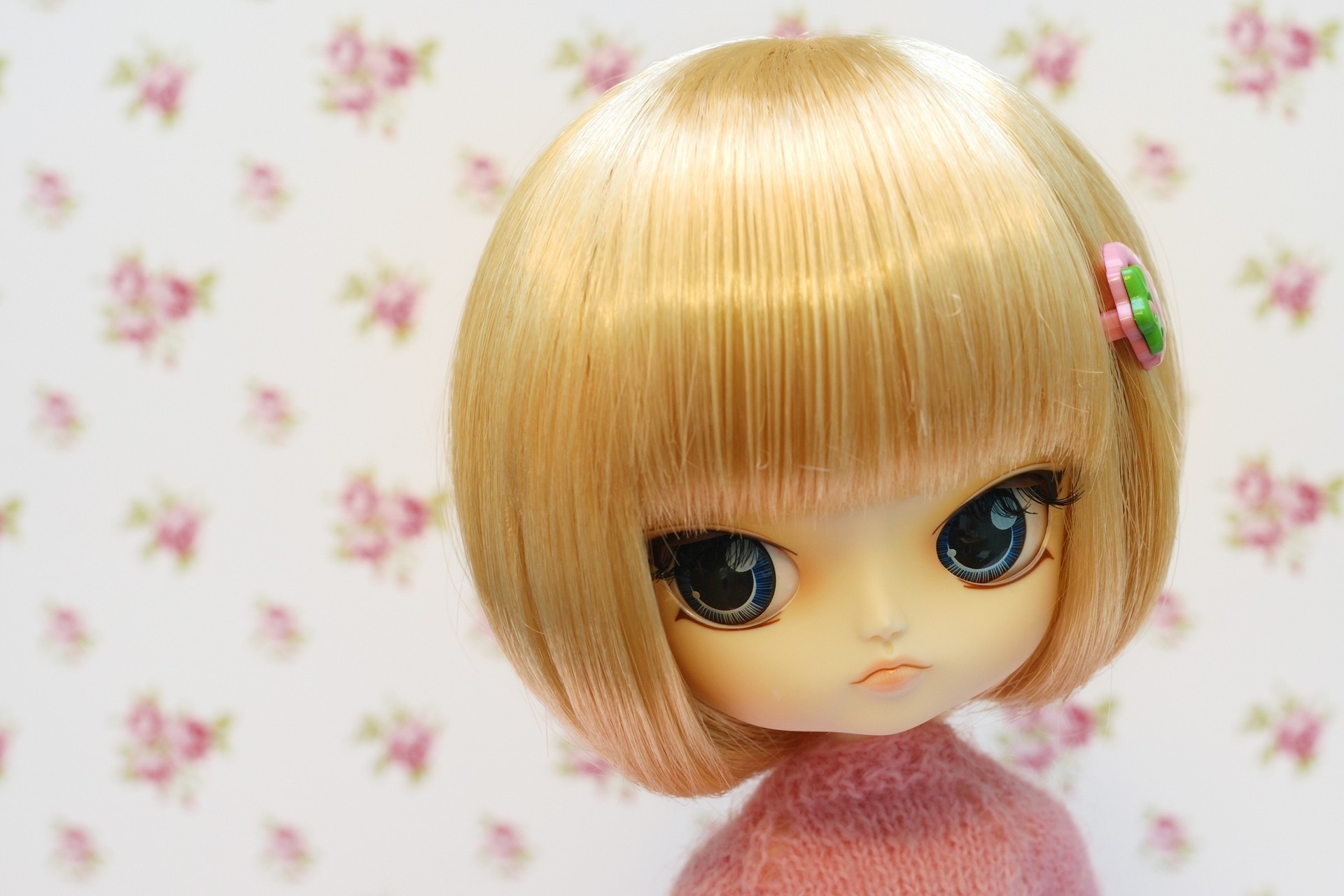 Big-eyed lalka z blond włosy na tle tapety