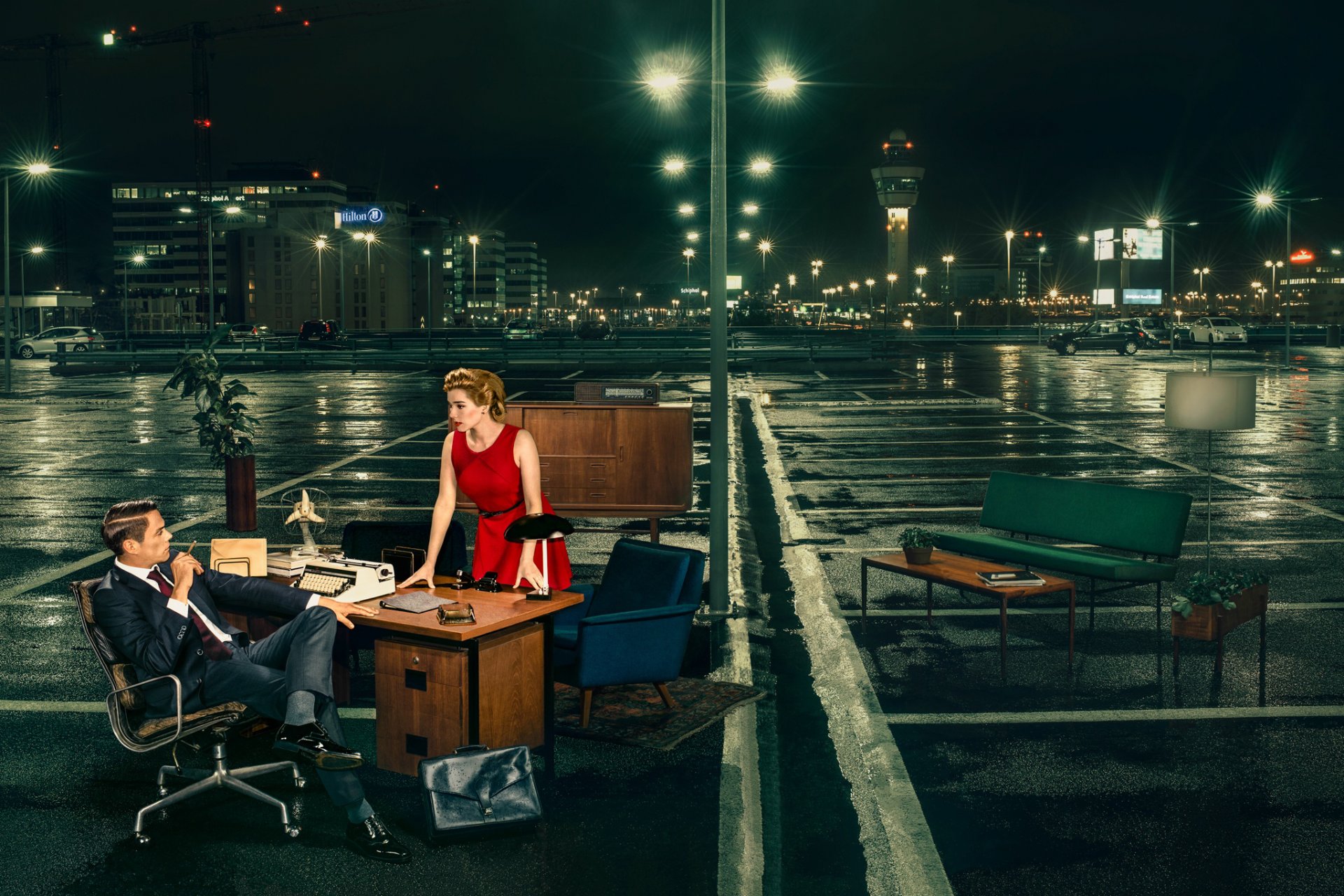 Biuro na parkingu w mokrym mieście