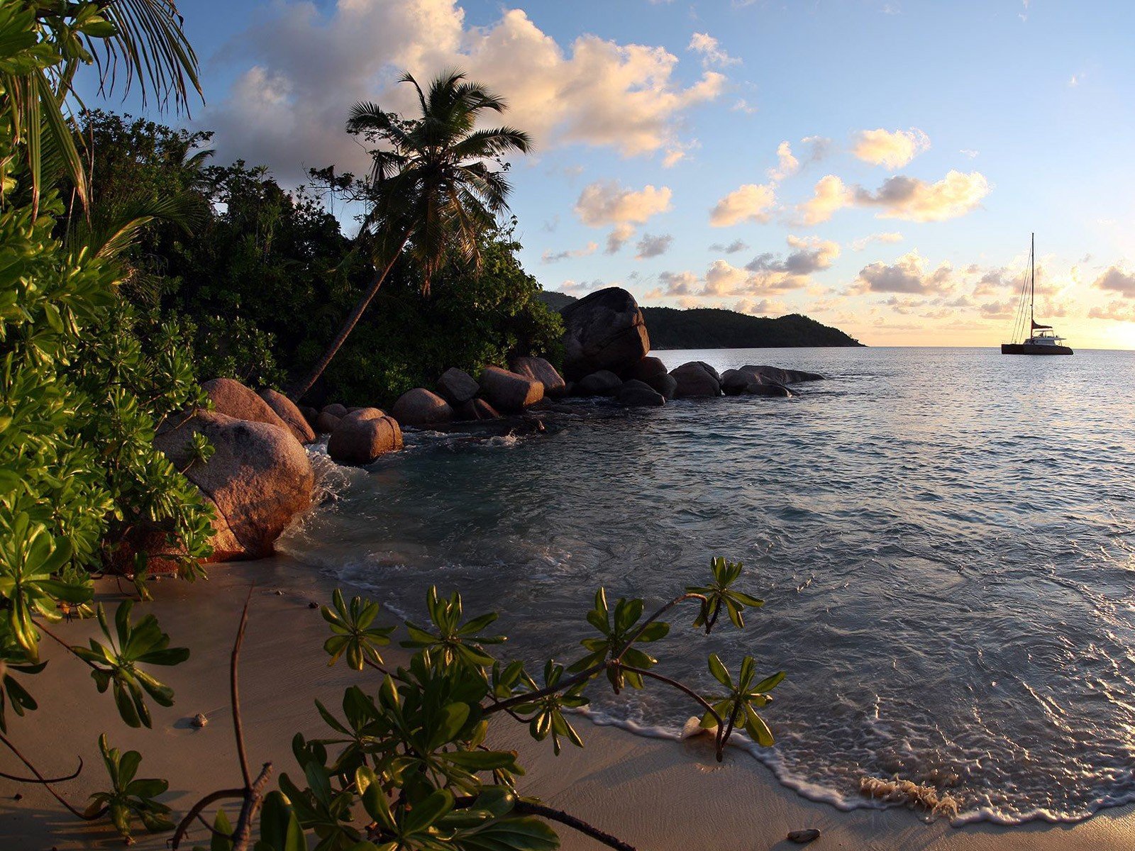 Brzeg z leżącym zantem, z widokiem na plażę z jachtem