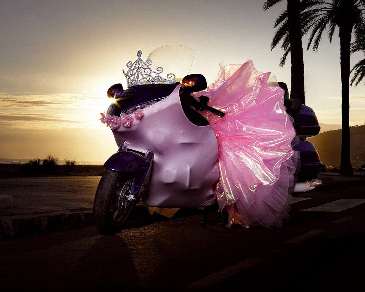 Motocykl ślubny o zachodzie słońca w kolorze różowym