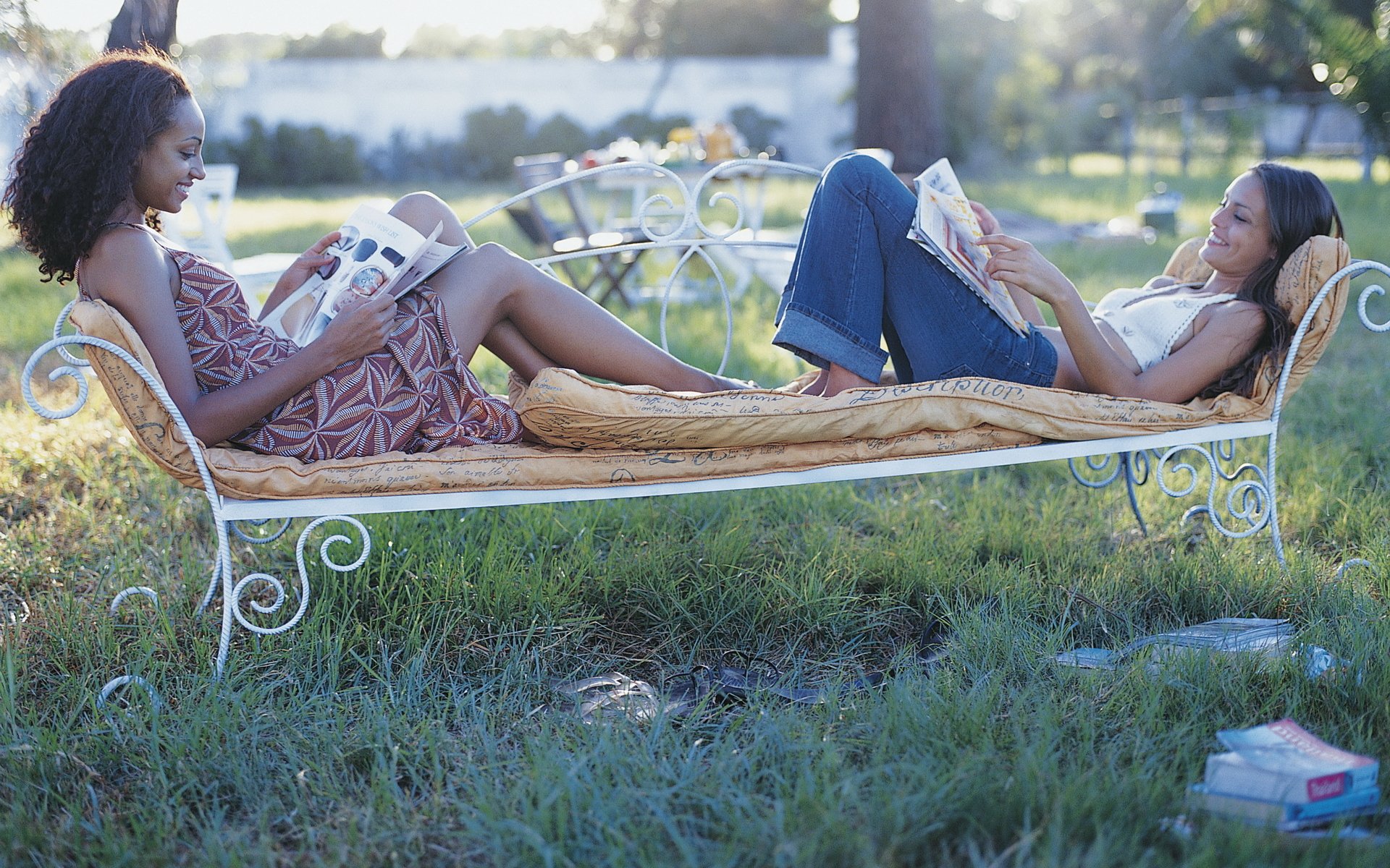 Dwie dziewczyny leżą na ławce i czytają czasopisma
