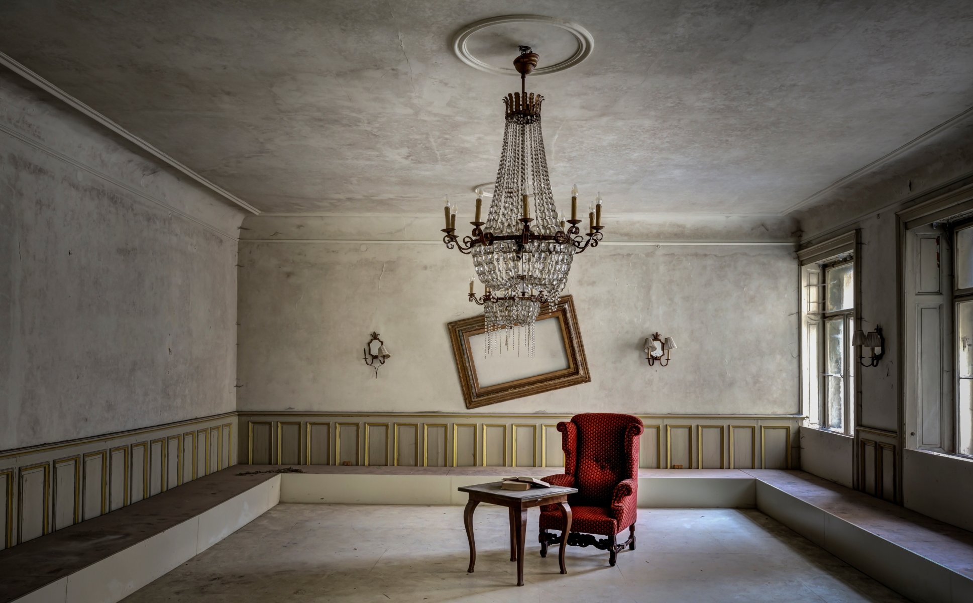 Nisko wiszący żyrandol pośrodku prawie pustego pokoju