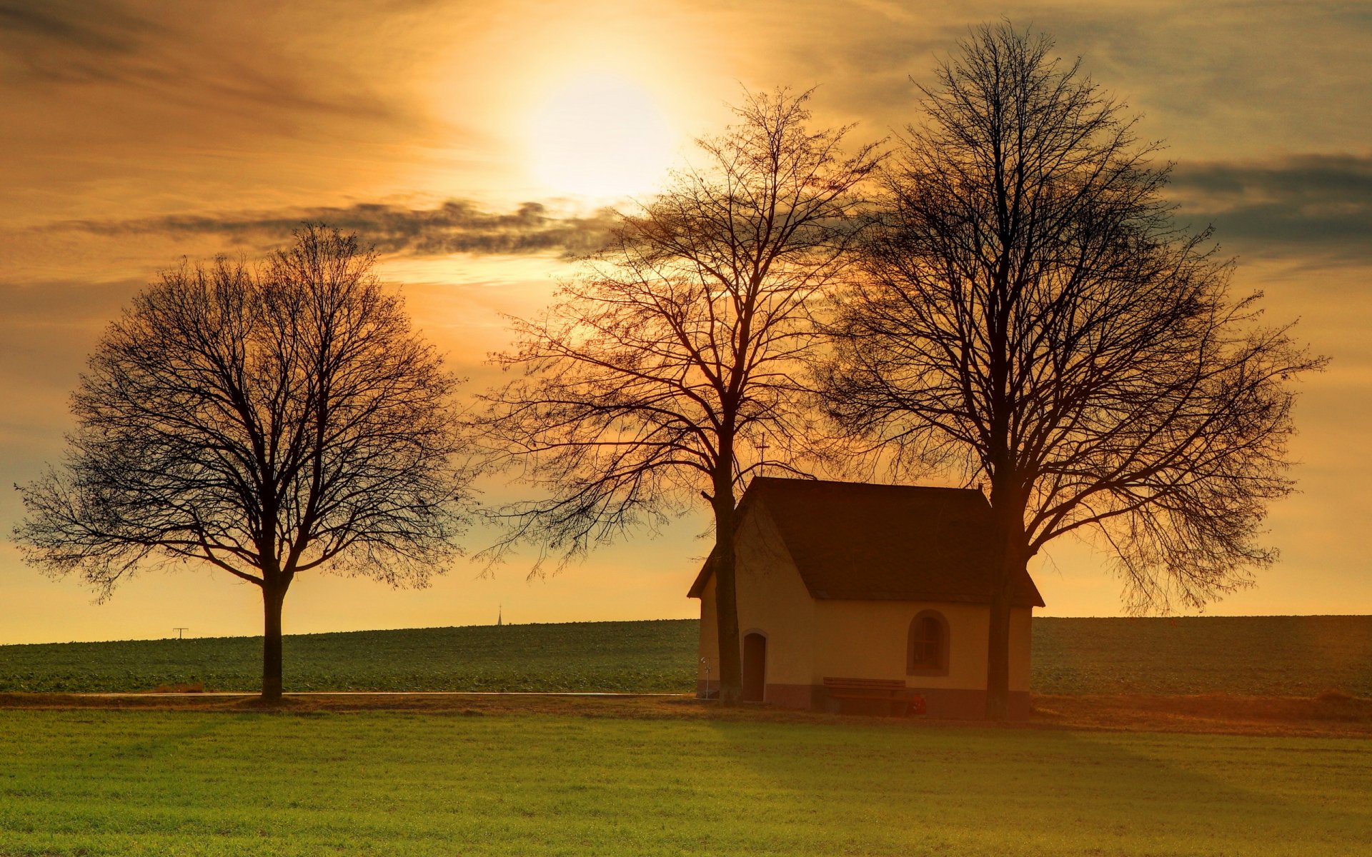 Zimowy krajobraz, drzewa w śniegu, dom w lesie