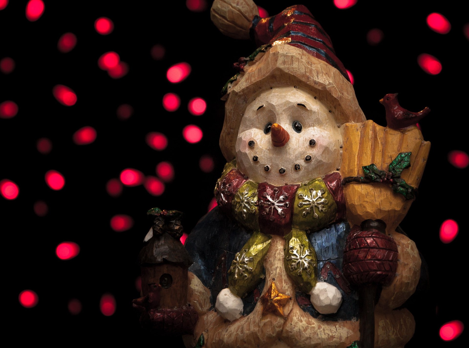 Bałwan zabawka obok czerwonych kulek