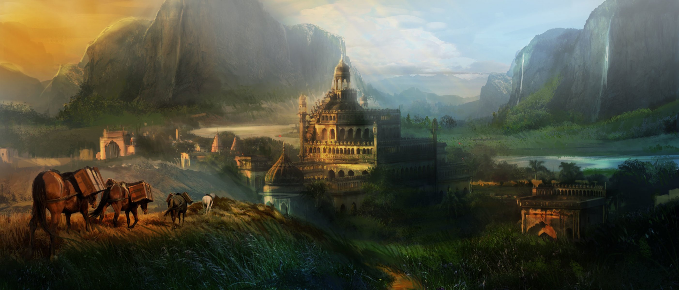 Karawana koni na tle gór i wodospadów