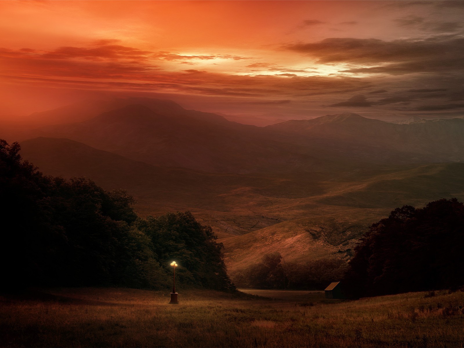 Siedząca na niebieskim krześle dziewczyna w niebieskiej sukience na czarnym tle i abstrakcyjnym drzewie za plecami