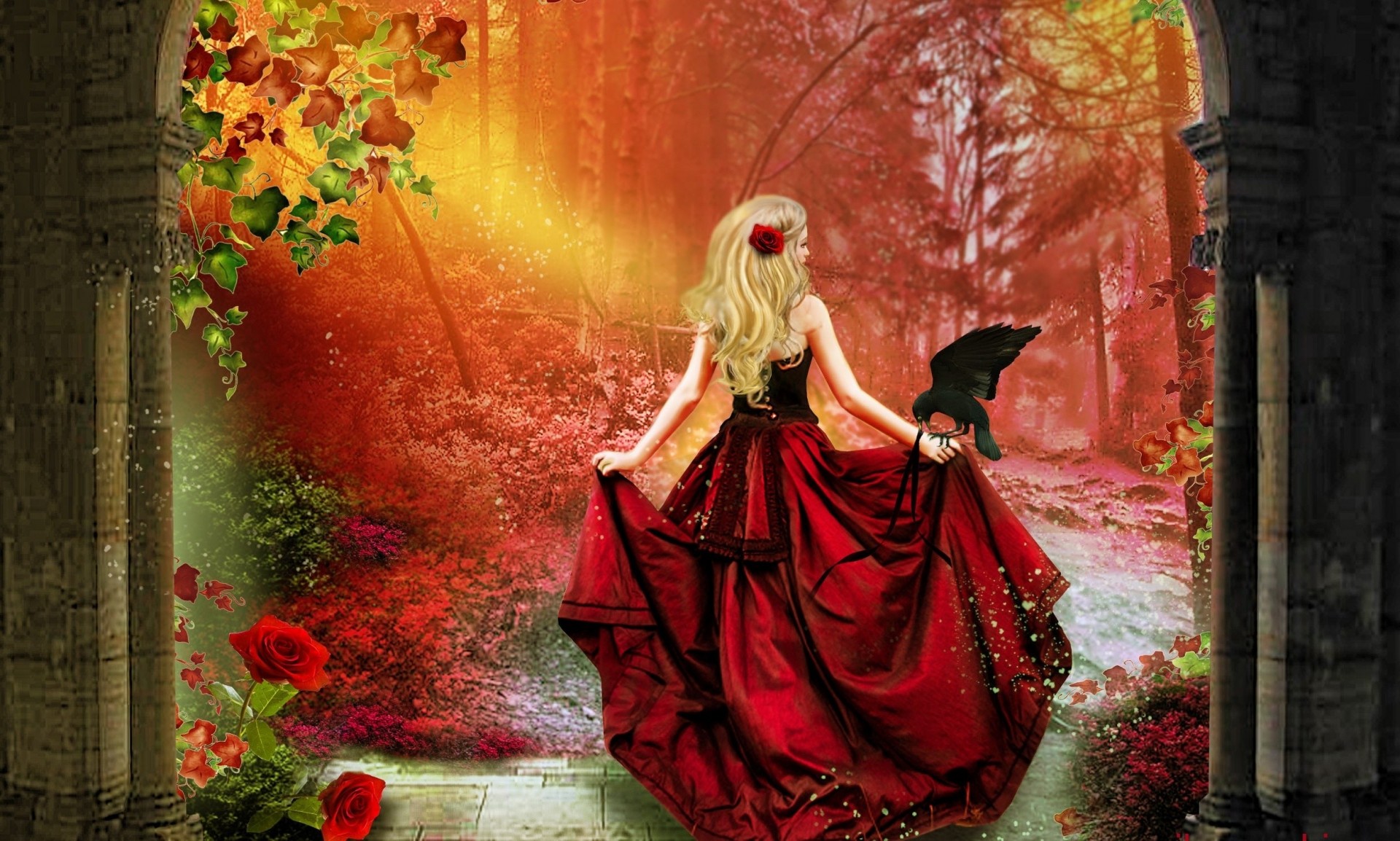 Fantasmagoria. Dziewczyna w czerwonej sukience w lesie