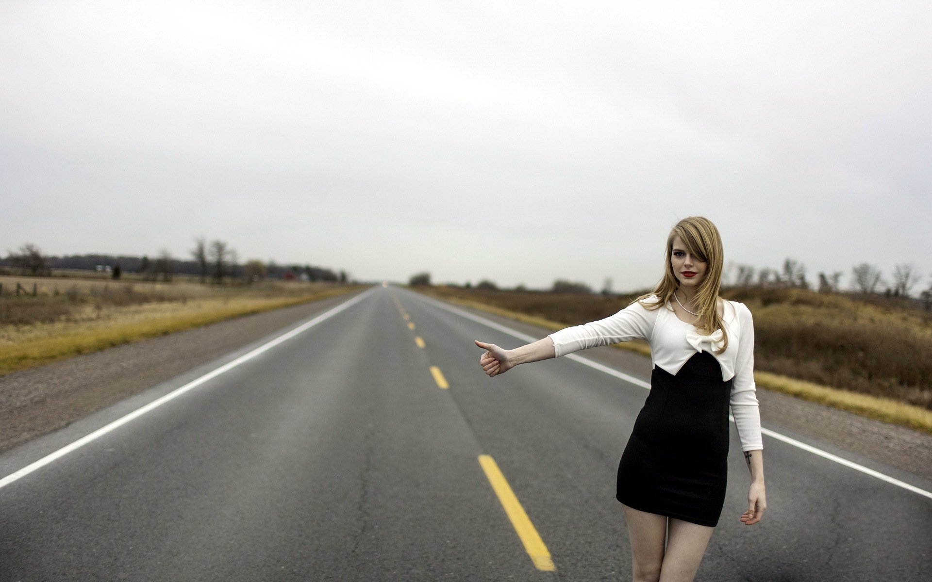 Dziewczyna siedzi na oponie obok drogi i głosuje