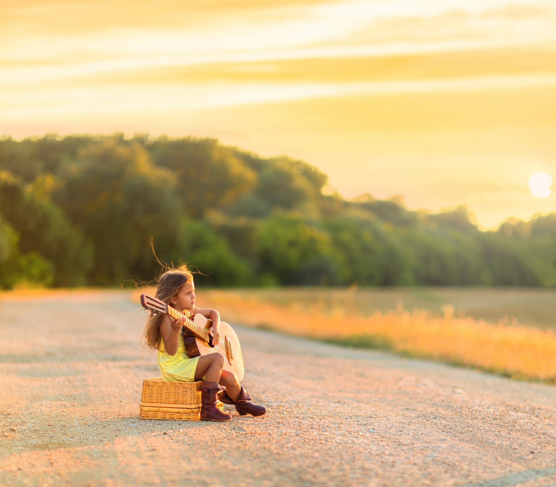 Dziewczyna piosenkarka leży z gitarą na trawie