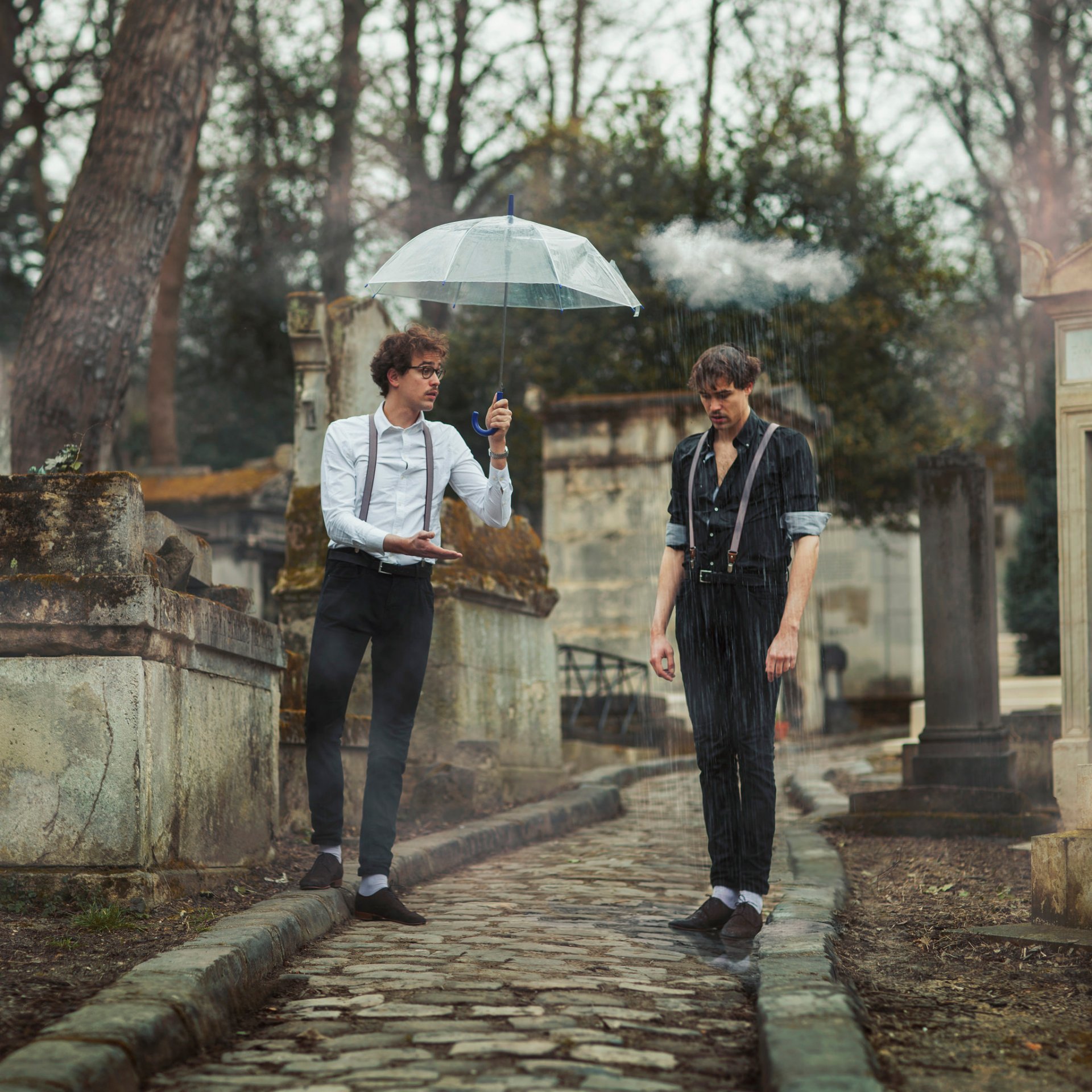 Dwóch mężczyzn w deszczu, jeden z nich pod parasolem