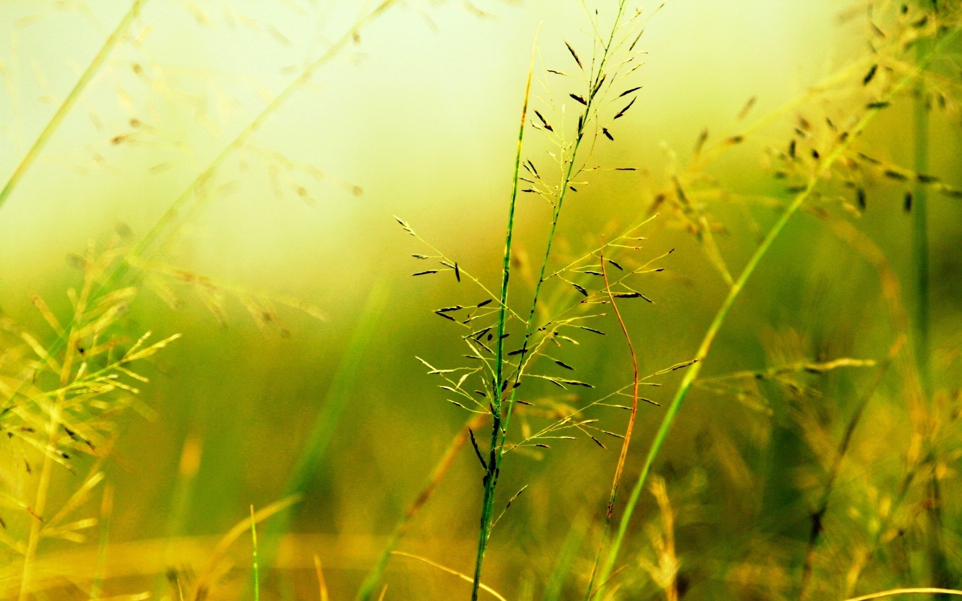 Zielone źdźbło trawy zaplątało się w promienie słońca. Jeden