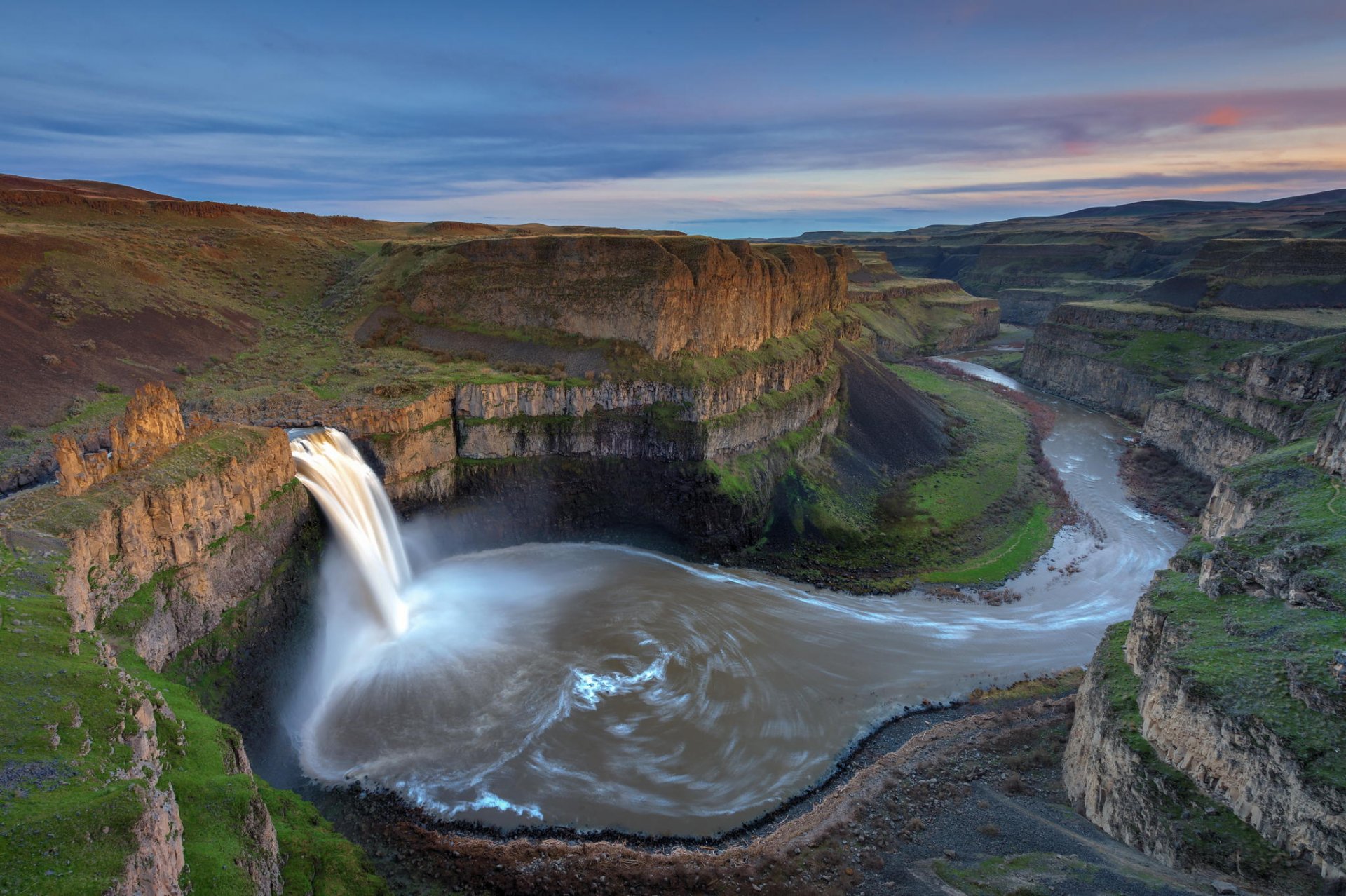 Rzeka z wodospadem wzdłuż śnieżnych klifów