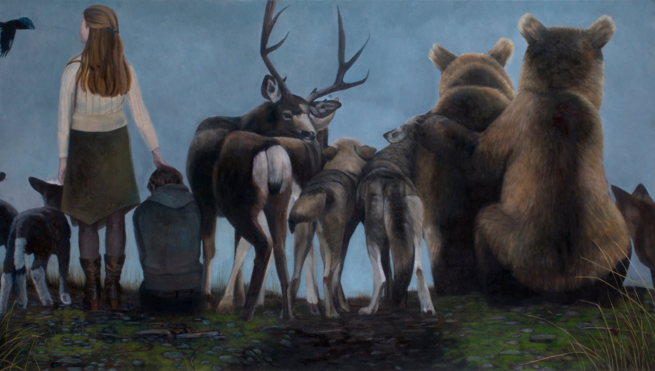 Dziewczyna z chłopcem i zwierzętami patrzą w dal