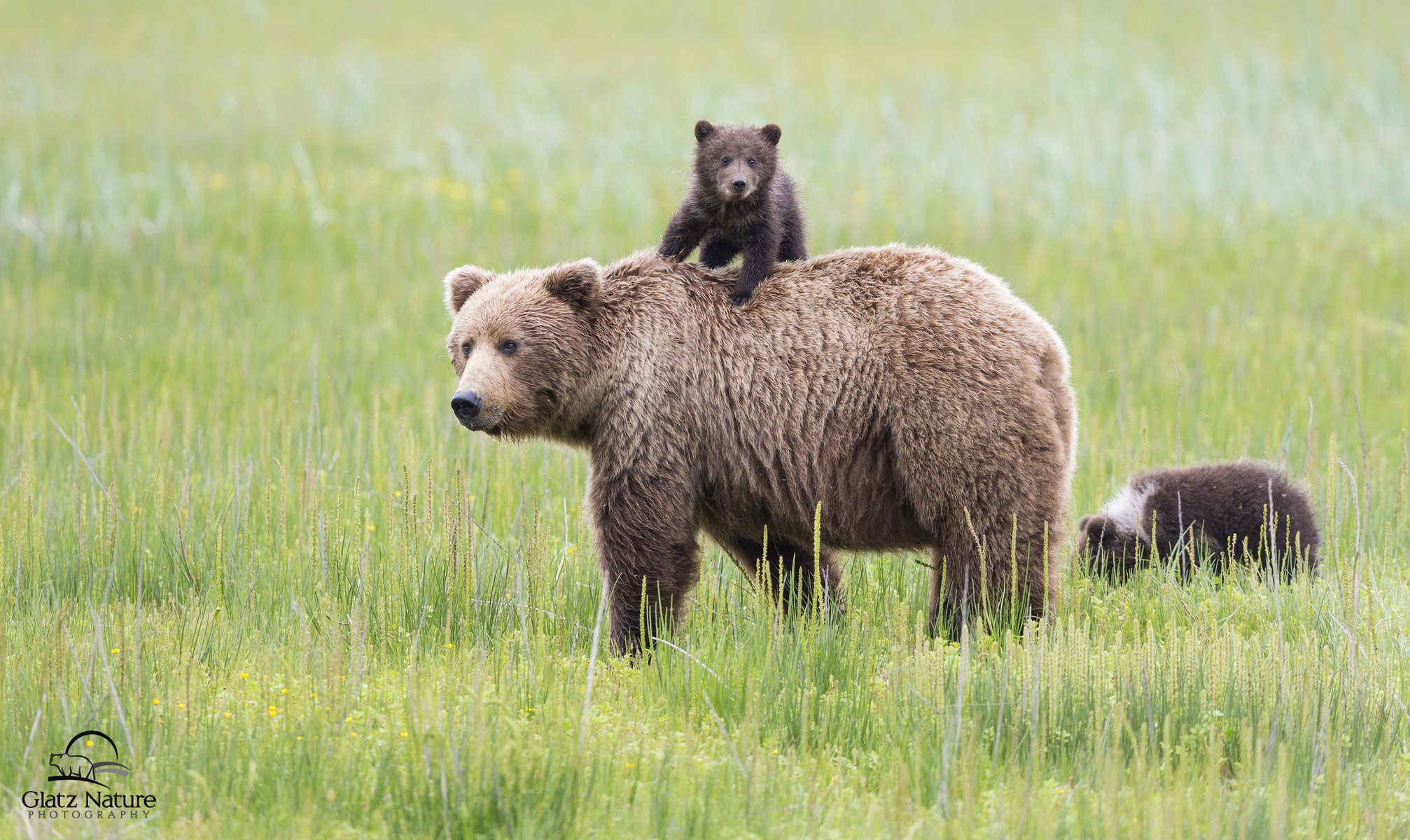 Niedźwiedź z młodymi spaceruje po trawniku