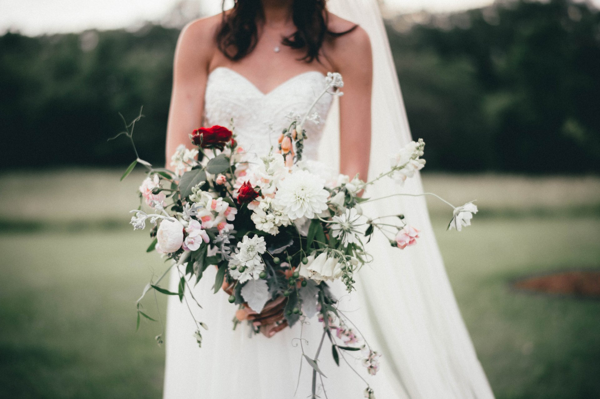 Panna młoda z bukietem piwonii, siedzi na krześle