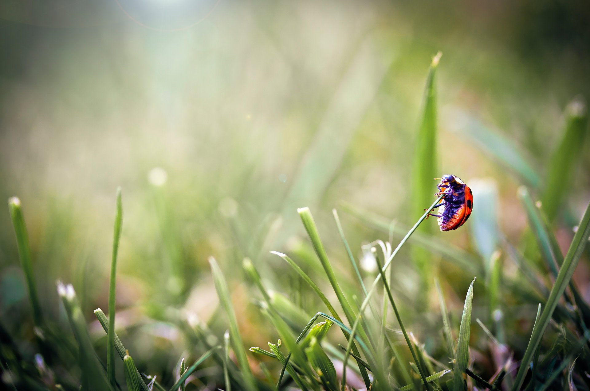 Makro zdjęcie biedronki na czubku trawy