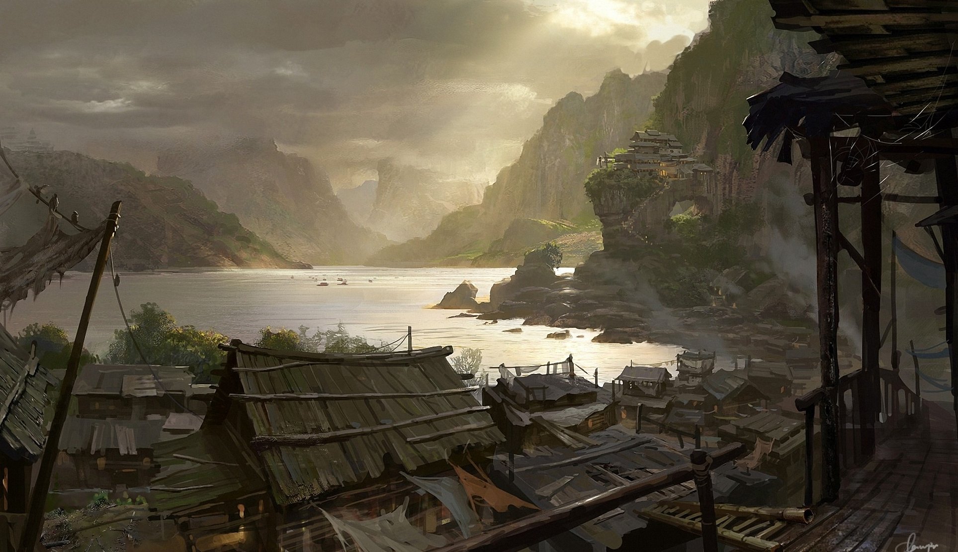 Krajobraz akwarela drzewo nad rzeką
