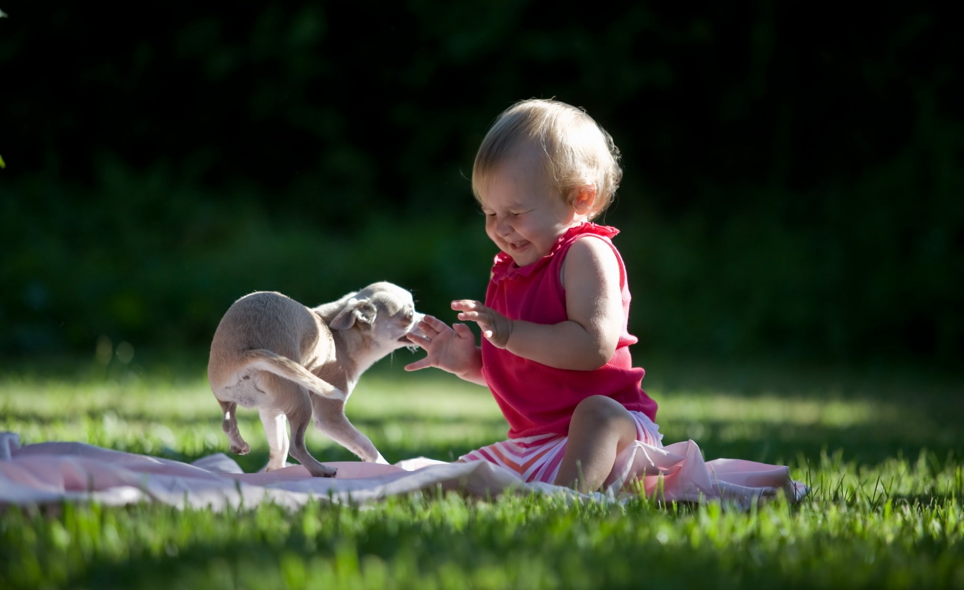 Małe dziecko z psem na trawie