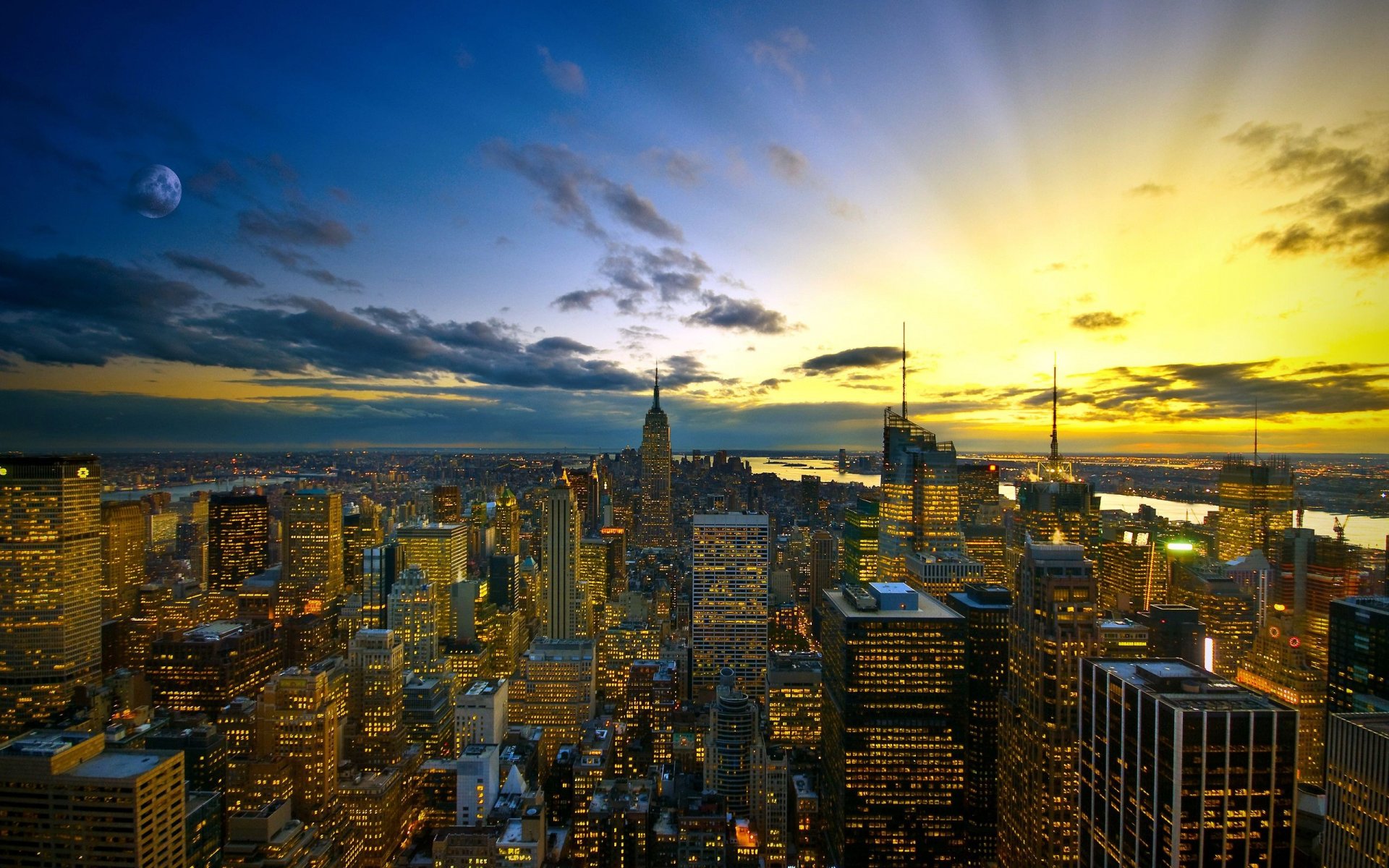 Zachód słońca nad nocnym miastem z pomarańczowymi chmurami
