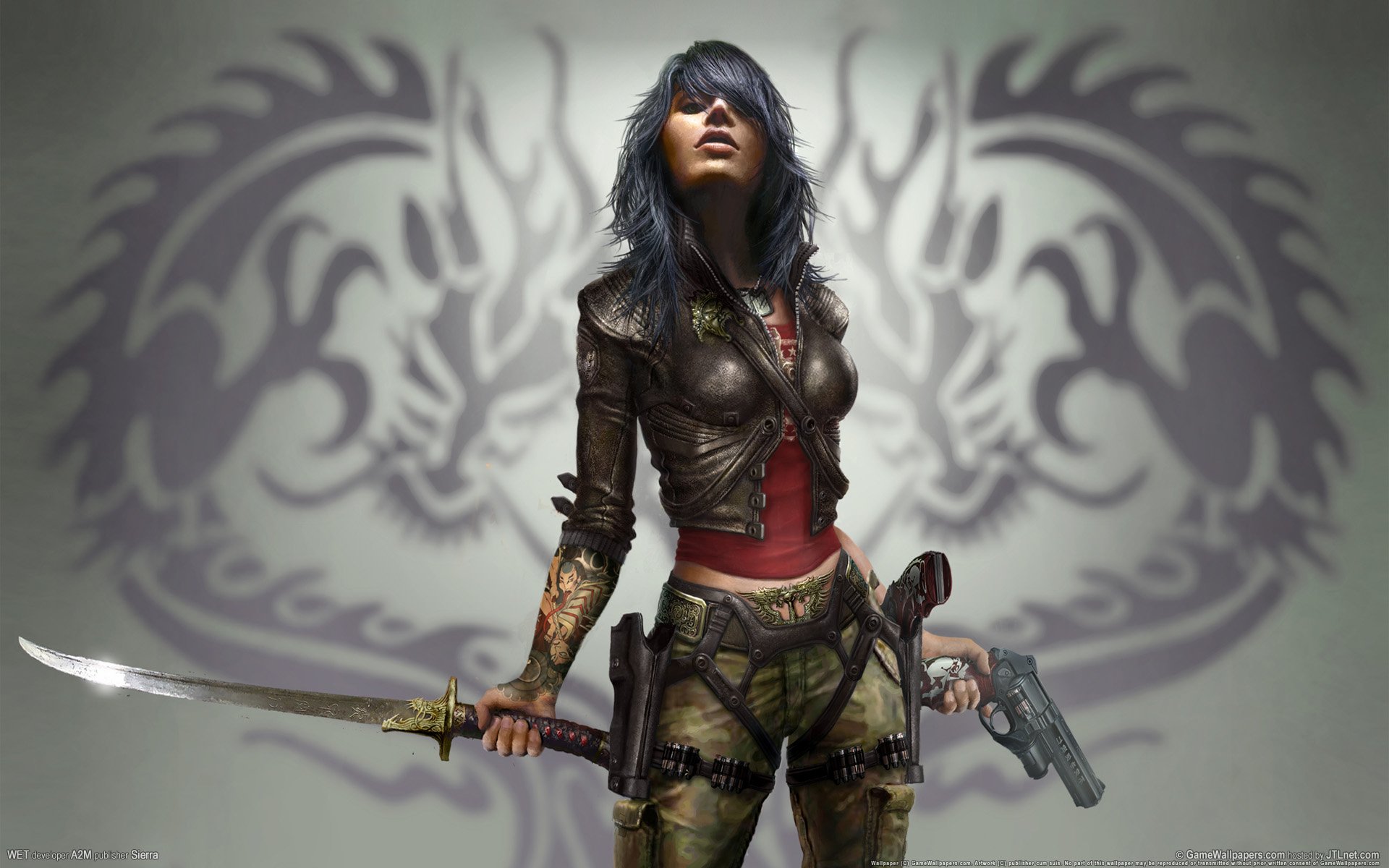 Ładna szczupła dziewczyna z mieczem i pistoletem