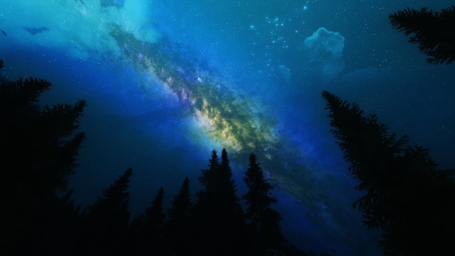 Drzewa na tle nocnego gwiezdnego kosmosu