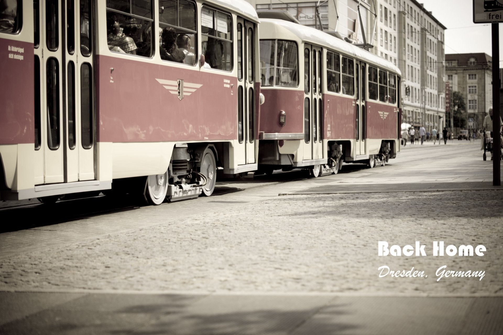 Tramwaj w Kolorze na czarno białych ulicach miasta