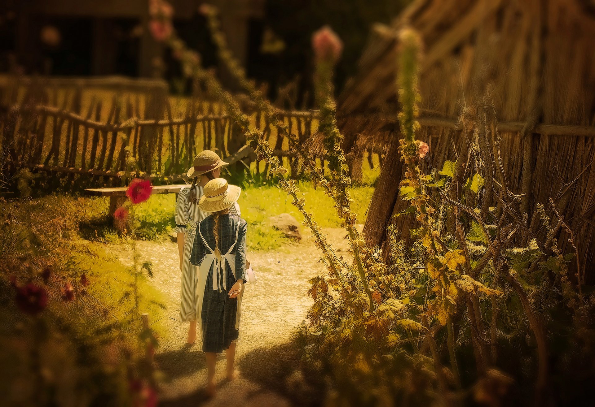 Wiejskie dziewczyny w kapeluszach idą ścieżką
