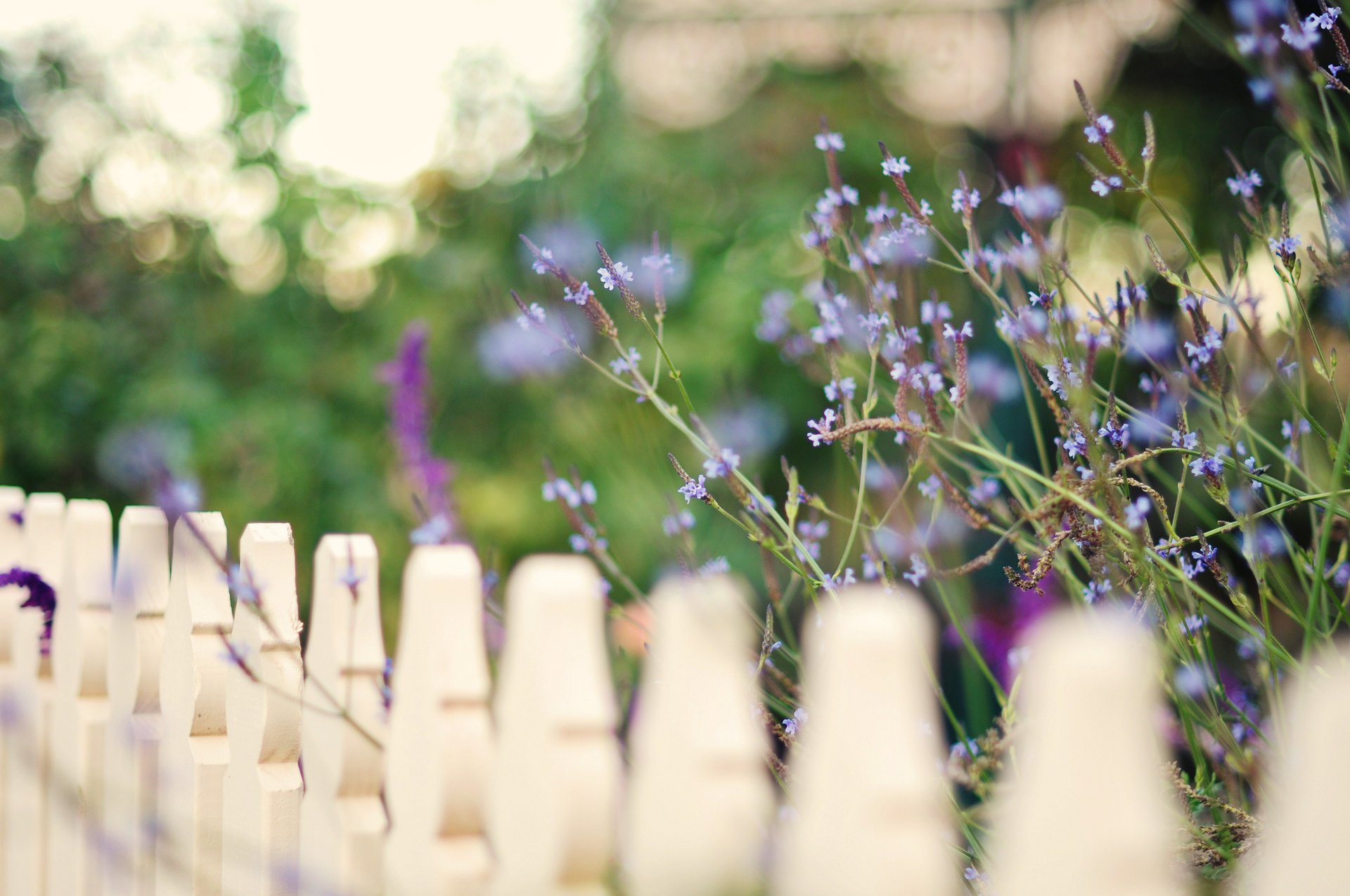 Fotografia makro białe ogrodzenie na tle kwiatów