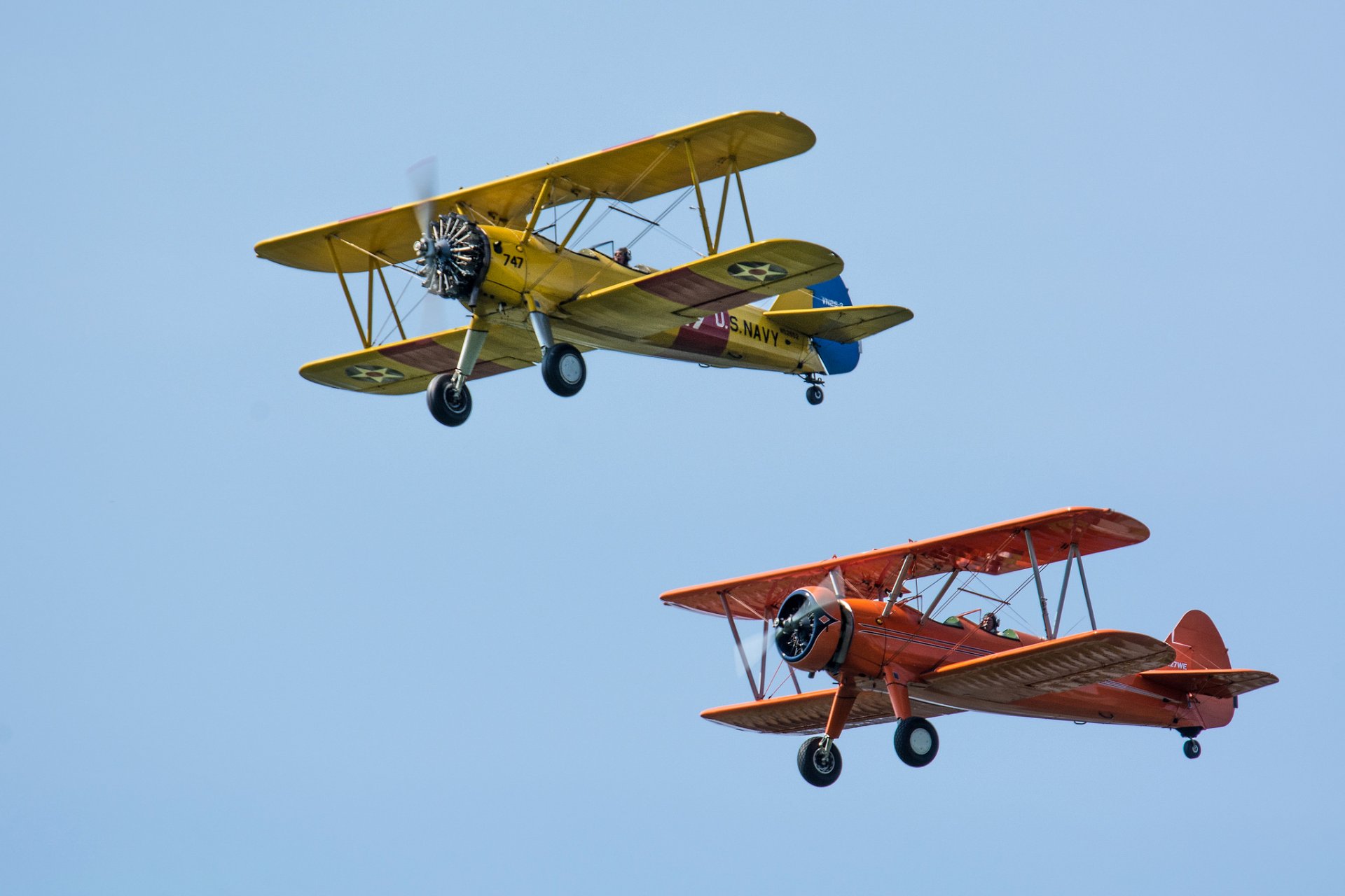 Dwa Retro dwupłatowce na tle błękitnego nieba