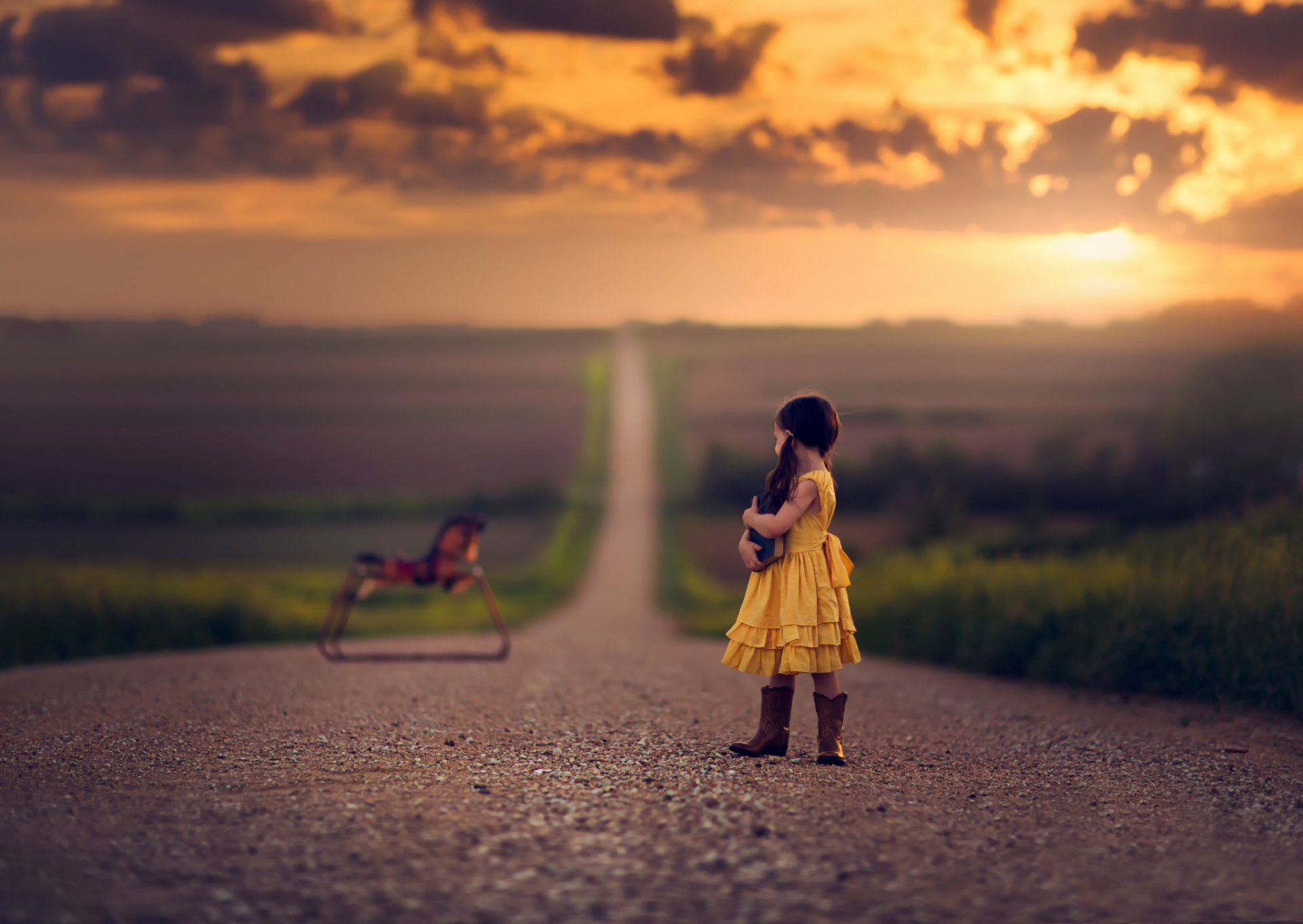 Dziewczyna w butach na drodze patrzy na zabawkowego konia